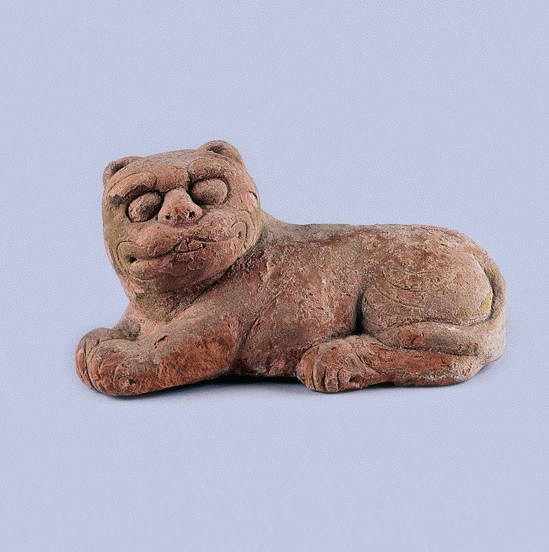 本件為清代陶製品,採素燒而成。整塊陶胚,雕刻完後再進行窯燒。大眼,眼球凸出,大嘴咧雙前牙,前腿直伸,後腿蹲踞,尾巴順著臀部捲回後腿上,後大腿上刻劃數道象徵毛髮的線紋,樣貌生動。虎爺崇拜屬於民間動物信仰,虎爺在寺廟中的供奉位置,大都在供桌下,民間習俗常見將健康不佳或易吵鬧的小孩子帶到有虎爺的廟裡,在徵得虎爺同意後,認虎爺為「契父」,藉以保佑小孩平安長大。虎爺具兇猛威武之勢,能使各種妖邪退避,故遠在漢代已是鎮墓獸之ㄧ,後來也專變成廟宇中守護之神。台灣大部分廟宇都會供奉虎爺,主要功能是請虎爺保護主神,並驅除瘴役、惡魔,以鎮護廟宇安寧。本件作品造形極佳,其年代距今已超過百年,極具蒐藏價值,非常適合展出。