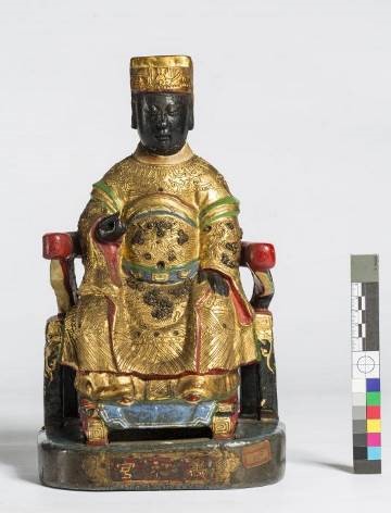 硬身木質。頭戴冠帽,黑面,閉目,大耳。身穿金色蟒袍,蟒袍下見有裙裝,在蟒袍和衣裙間有劍帶露出。右手呈握姿,左手放於腿上,身坐圈椅。座正面有款「萬和宮」;椅背貼條「老大媽 大魚池」,底以錫包裹。