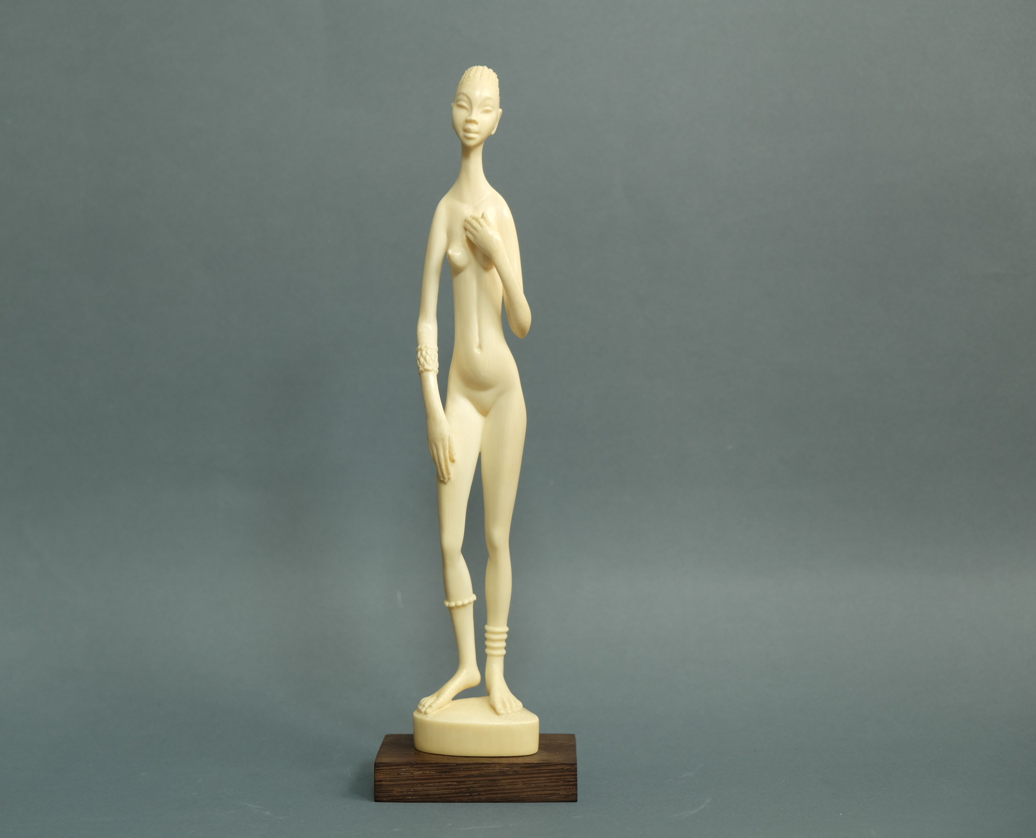 藝術家以象牙為材料雕刻出非洲女性美麗的裸體身形,非洲特有髮型、腕飾、腳飾及非洲人特有的臉蛋線條,精工細緻。作品上除了刻工線條,本身象牙的布紋更襯托出整件作品的流暢細緻的絲滑刻工。