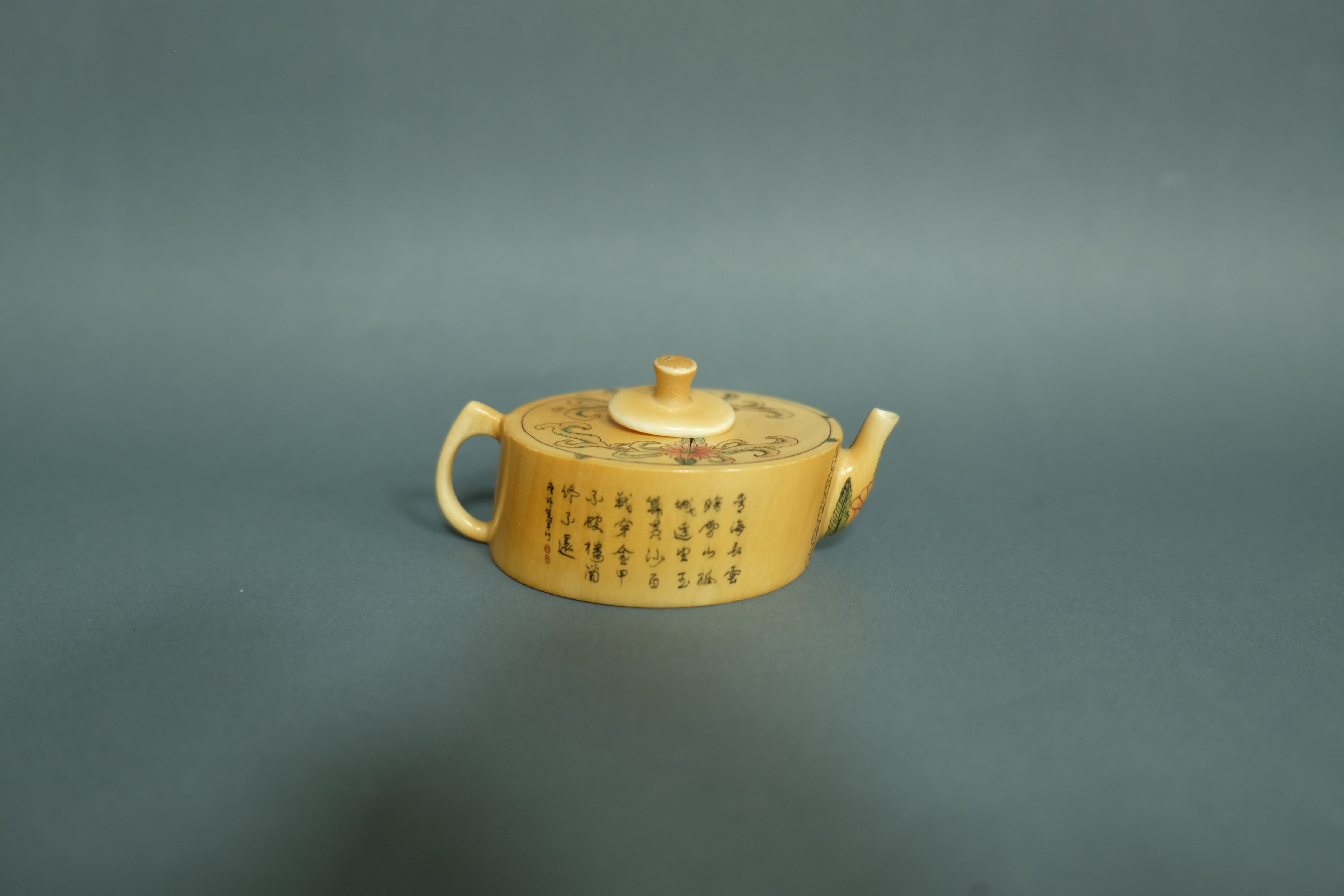 牙雕壺是由多片象牙雕刻組合而成,壺蓋小巧呈橢圓形,壺頂以淺雕刻紋飾兩朵花卉及末端捲曲身長樣的葉子裝飾性的壺嘴以淺浮雕的方式刻出一朵花卉及三片葉子,隨著壺嘴延伸向 上,壺身與壺嘴連接處兩側有淺雕黑色花朵紋飾各五朵。壺底淺雕黑色花朵紋飾三朵,特別的牙雕染色技法,藝術家在 每個刻痕處染上紅色花瓣、綠色葉子。 壺身一側刻有竹及雅石,竹枝上有五色鳥一隻,踞足休息,並有〔春風得意〕的文字及紅字題款〔江人〕。 另一側刻有唐代王昌齡的詩〔從軍行〕青海長雲暗雪山,孤城遙望玉門關。黃沙百戰穿金甲,不破樓蘭終不還。同色題款唐詩從軍行,紅字題款〔西江人〕。