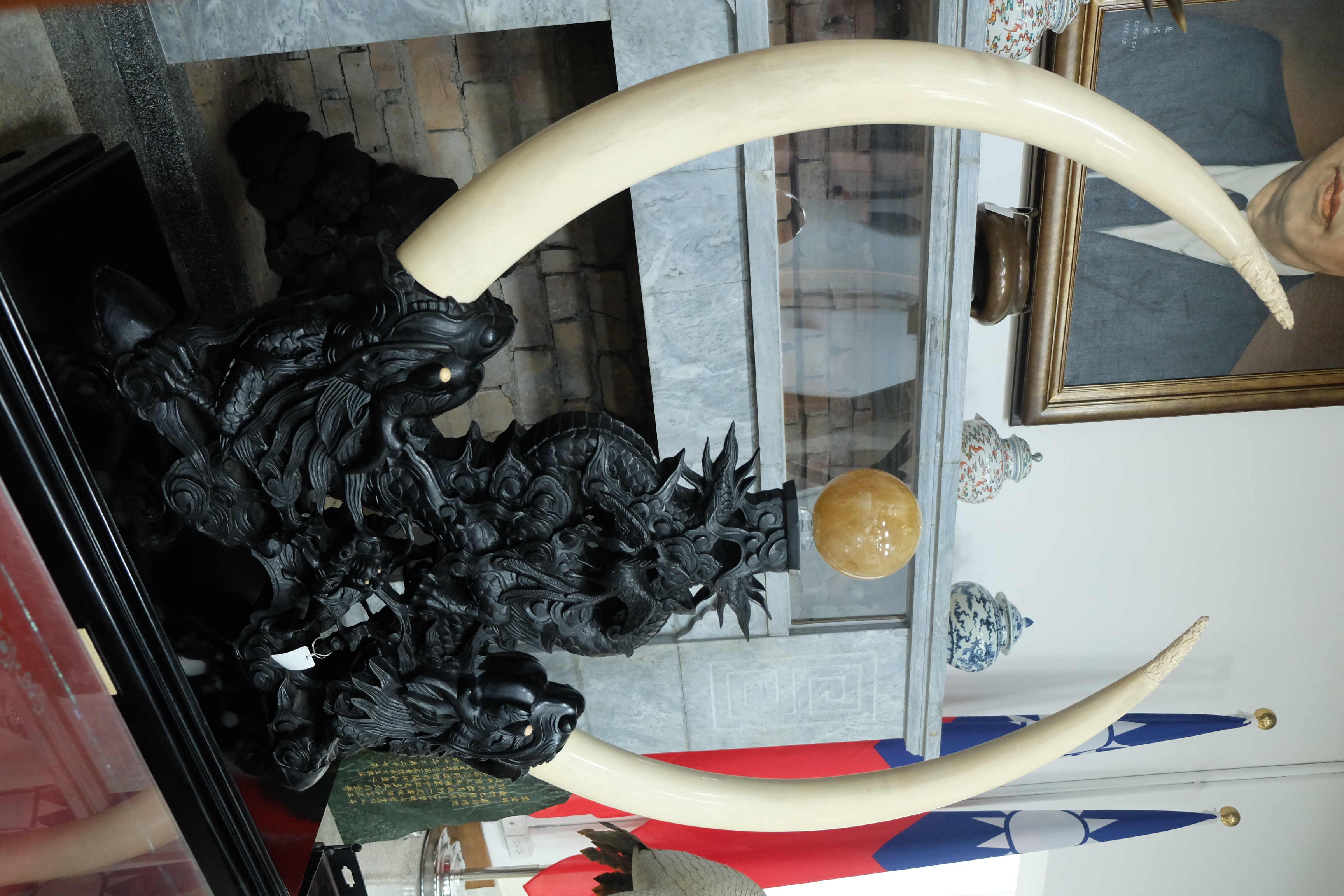象牙經刨光與修飾處理,呈現出純潔的牙質瑩潤,而象牙本身的自然彎曲弧形,顯示出此象牙的質感與珍貴,其根部較粗,而牙尖較細,接近一半屬於中空。在牙髓腔至外表皮部份有象牙特有的布紋,在結構上較為緻密。顏色呈乳白色,面上有環狀粼波紋數圈,亦有縱向雀紋夾雜其間,尖端以高浮雕及圓雕的技法雕刻出龍首鳳身的龍鳳呈現的寓意。 底座由雙龍面向左右,嘴巴承接象牙,龍的眼睛由圓珠象牙鑲嵌而成,龍的尾巴成S形,中間祥雲圍繞,還有一隻鳳凰立於中間,同盛一個平台,平台上置一顆水晶。 底座正中間還有一隻小龍,臉朝上吐出祥雲,整體雕刻細緻精美,呈現出龍鳳呈祥的寓意。