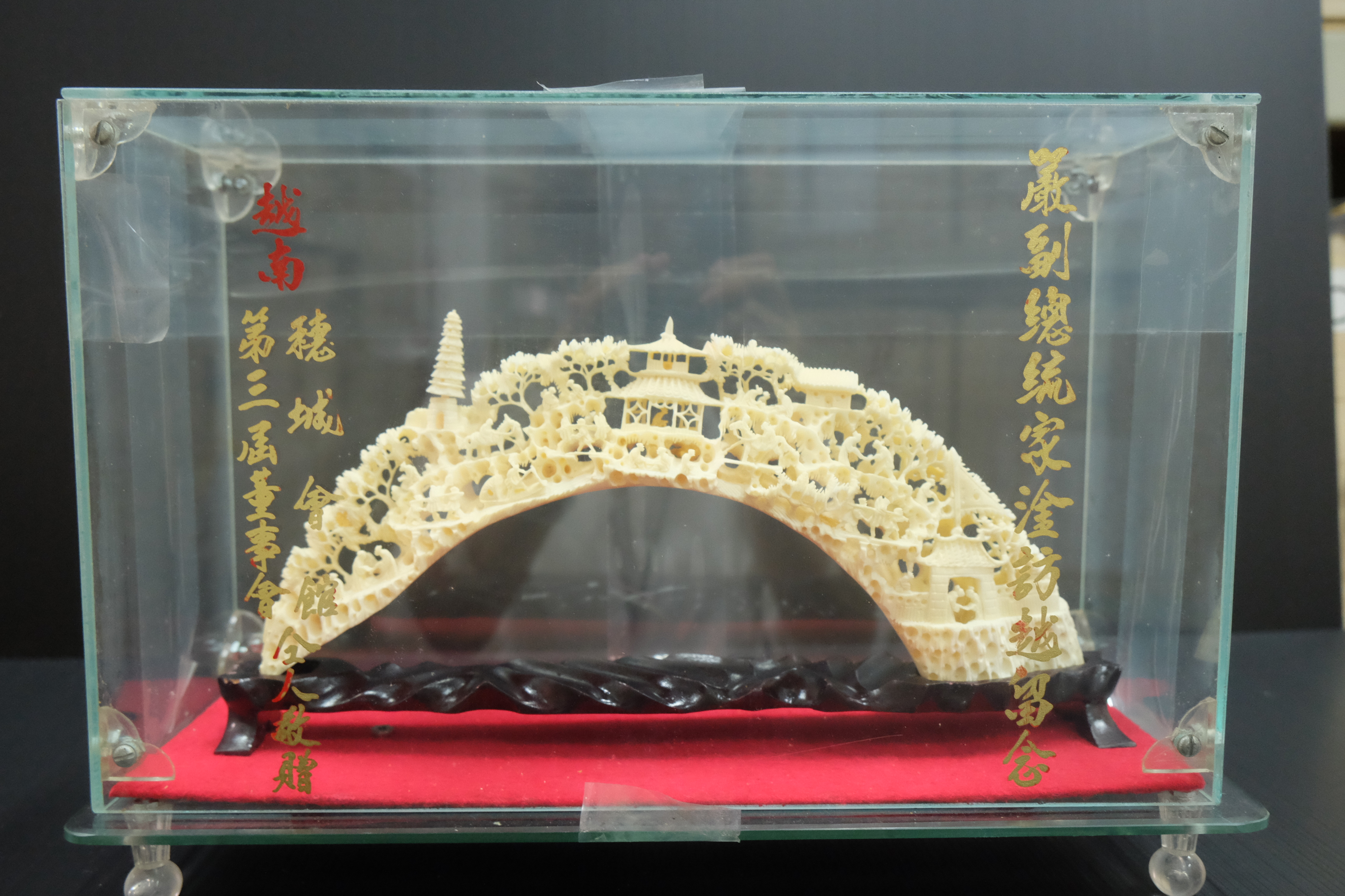 此藝術牙雕作品,藝術家將象牙運用雙面透雕、鏤刻及圓雕法,以整段象牙為雕料,牙質瑩潤、精鏤細刻見長,整體布局繁複熱鬧,不留空白。 藝術家以中華文化為主軸,雕刻出中華亭園樓閣、寶塔、山水及人物,寫實生動的人物或划船、騎馬、挑擔、抬轎、打躬作揖或於庭園中風嫻雅頌…等顯示出社會各層人們的活動,整座雕刻參天松木與岩石鏤雕串連出一幅如立體畫般具體而微的河山風光。雖是越南製品,然整座亭園樓閣及人物皆以中華服飾為主,顯示著中華文化對越南的影響。 此件藝術品有一個附屬物,記載此藝術品之重要意涵,附屬物為一個玻璃罩框,玻璃框上題款 右側:嚴副總統家淦訪越留念。 左側:越南穗城會館第三屆董事會全人贈