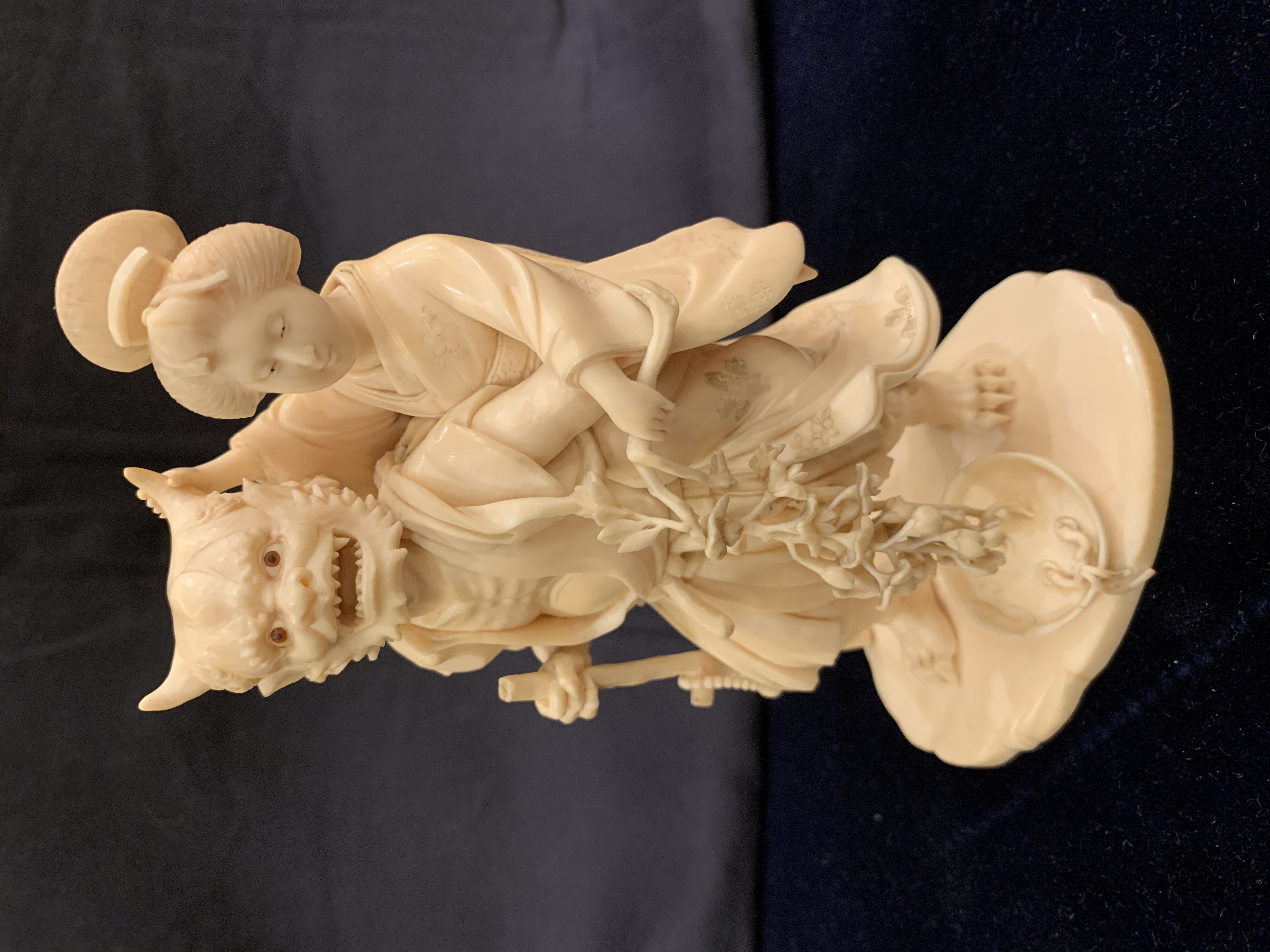江戶時代,出版業盛行,此時的日本又受到中國古代典籍《山海經》、《封神演義》、《西遊記》、《聊齋誌異》、《錄鬼簿》等深刻影響,陸續編撰記載著奇聞異事的圖文事典,例如《和漢三才圖繪》等,加上浮世繪的流行,奠定了日本傳統妖怪的造型基礎。 本件作品即是以古代奇書《錄鬼簿》中,呂洞賓三次到岳陽樓,終於度化柳樹精和桃花精學道成仙的曲折故事微雕琢主題。柳樹精面容奇特滑稽,頭頂出雙角,濃眉大眼,闊鼻咧嘴,露尖牙,鬍鬚濃密,表情猙獰。身著袒胸衣袍,腰間綁帶,裸足矗立,右手持木杖,木杖上吊掛一串佛珠,代表柳樹精已學道成仙,樹精左手後攬,揹著桃花精。桃花精面容秀美,梳高髻,身穿傳統和服,手持一截桃樹枝,枝枒間葉片茂密,桃花盛開,秀美雅致。藝術家以獨特的角度,精選傳說故事為題,施以細膩雕工,並大量使用鏤雕技巧,完美的呈現仙界與人間三度空間的意境,刻劃入微,極為巧思。作者生平不詳。