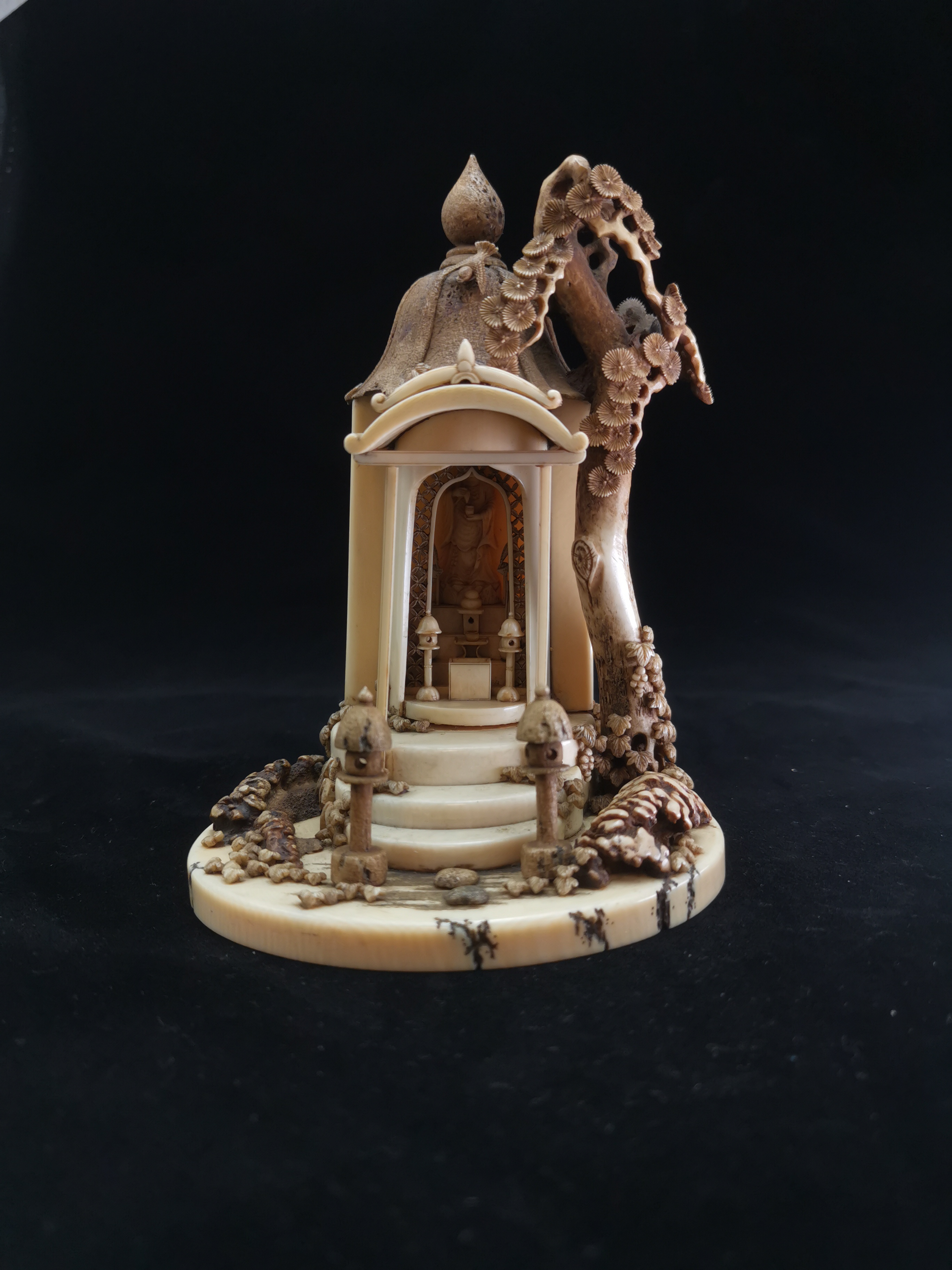 《日本書紀》記述,佛教於552年傳入日本,天主教則在1549年進入日本。江戶時期,佛教衰落,神道教擺脫附屬地位而獨立發展。明治維新後,為鞏固皇權,以神社和神道作為國家神道,提倡「神皇一體」、「祭政一致」,神道教獲得空前發展,成為天皇統治的重要思想武器。 在建築上開始引入西方技巧、材料和風格,建造與傳統有迥然不同特色的建築,建築師進而開始在早期基礎上,尋找日本文化與西方理念重疊的部分,相互融合,成為既有西方理念又有日本風味的特色建築。 本件作品的外觀線條顯露著歐洲風格,是明治時代受到「西方」異國文化影響,設計為家廟寺院建築造型的小型佛堂。內置觀音,觀音秀美端莊,形如仕女,法髻高綰,面目慈祥清秀,身著袍裙,裙襬飄逸,自然而流暢。右手持柳葉,左手捧淨瓶,以甘露遍灑天下,為慈悲理德的象徵。佛堂前的小庭園加入中國園林的常見素材,如石燈籠、草皮、翠綠蒼松等,底部刻有「民玉」款。 裝飾技法上,應用中國瓷器特有的「過枝」裝飾技法,連綿的草葉攀至底部,又加上自唐代開始的「茜色」工藝作局部妝點,使整體藝術效果極強,佈局既創新,又體現日本園林獨有的特殊韻味。