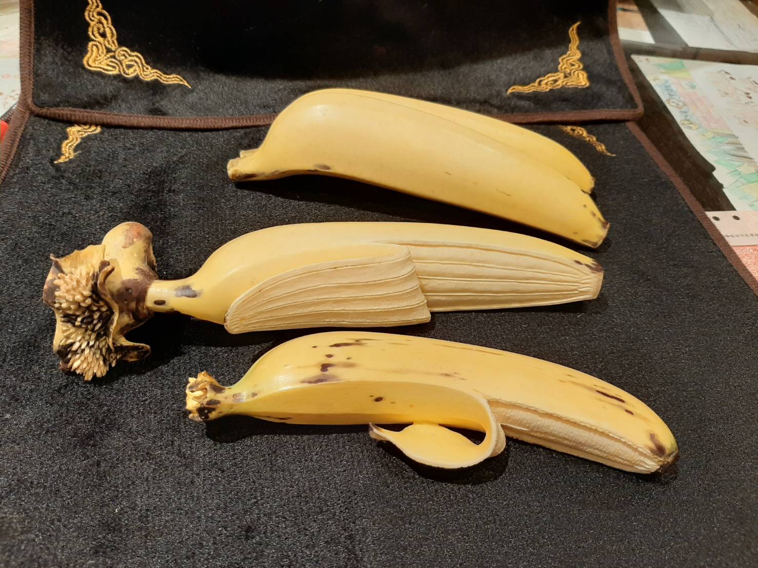 栩栩如生宛如真品的牙雕香蕉,從蕉蒂到剝皮之內部維妙維肖,尤其色澤之功力令人嘆為觀止。