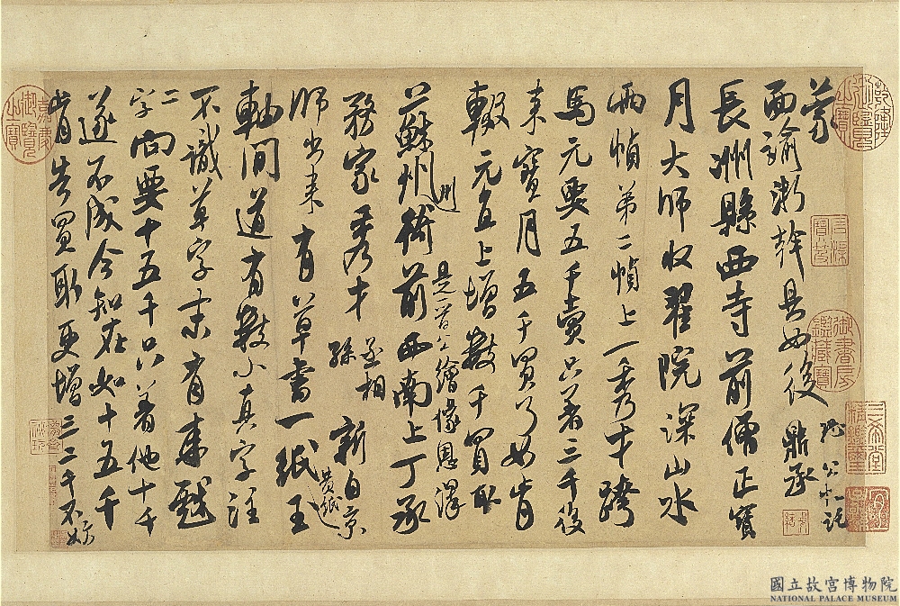 米芾(1052-1108),字元章,號海岳,襄陽(今湖北襄樊)人。書法與蔡襄、蘇軾、黃庭堅並稱「北宋四大家」。 此卷集結〈面諭帖〉等九件墨蹟,無紀年,研究指出分別書於徽宗崇寧元年至五年(1102-1106)之間。用筆縱橫如意,結字穩健成熟,書藝表現卓越超群。內容書寫生平交遊與寄情翰墨古玩收藏等情事,可謂晚年心志所寄的綜合呈現。 原帖入清後為王鴻緒(1645-1723)所庋藏,並合裱為一卷。乾隆朝時經《石渠寶笈》初編著錄,刻入《三希堂法帖》之中。