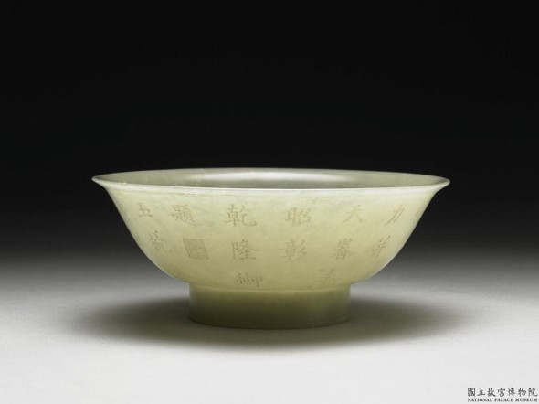 此碗侈口,高圈足,造形與游牧民族用以喝奶茶的「奶子碗」十分相近,應是十八世紀回部貴族使用的玉製容器,反映了獨特的草原生活情調。 乾隆二十年(1755)清軍討伐伊犁成功,並令大和卓木回到南疆。此碗為次年由大和卓木呈貢,見證乾隆皇帝經營回部的歷程。