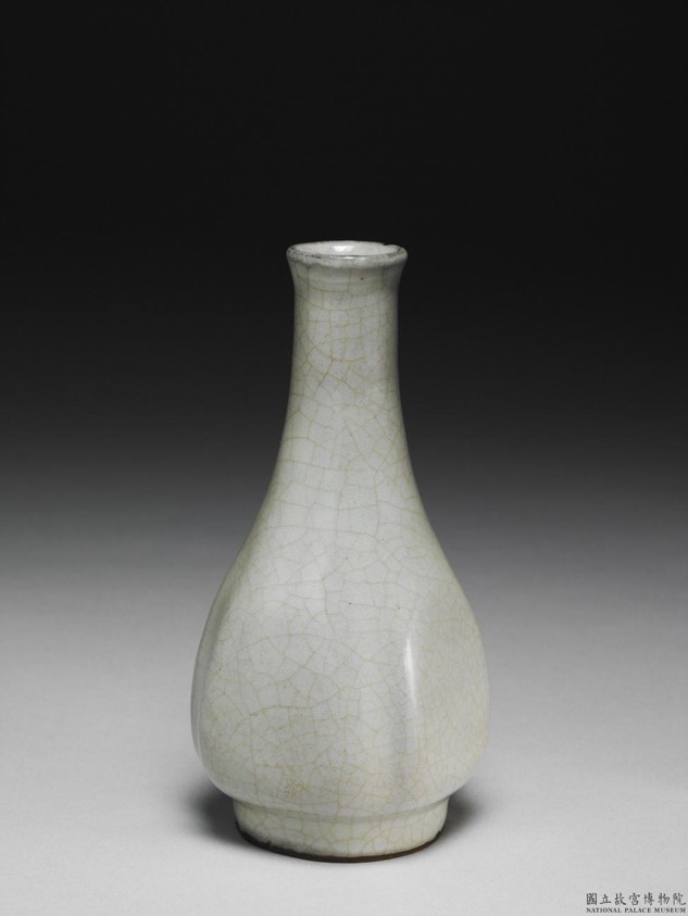此器呈斂口捲邊,長頸,腹部上斂下豐,平底,矮圈足。腹部四凹稜,面成扁平。薄胎厚釉,色勻而潤。口沿現灰色邊,碎紋密佈。足底露胎,外塗赭色汁。底面鐫刻乾隆皇帝〈詠官窯瓶〉御製詩。詩末署「乾隆壬寅春御題」紀年銘(乾隆四十七年,1782),並落「太璞」一枚鈐印。現今所知傳世帶有御製詩的瓷器,約為130件,可知數量特別稀少。透過御製詩的內容以及器上鈐印,可推知乾隆皇帝對此器的識別與鑑賞觀。此器造形模仿自玻璃器,為當時不同材質之間工藝交流的具體例證。於郎世寧和金廷標合繪〈乾隆古裝像軸〉,可見與此器極為相似之作,推測該瓶曾為乾隆皇帝書房中的花瓶。另外,依照嘉慶朝《陳設檔》(1802)的紀錄,可知此瓶屬養心殿前殿東暖閣「博古格」的文物,益顯珍貴。