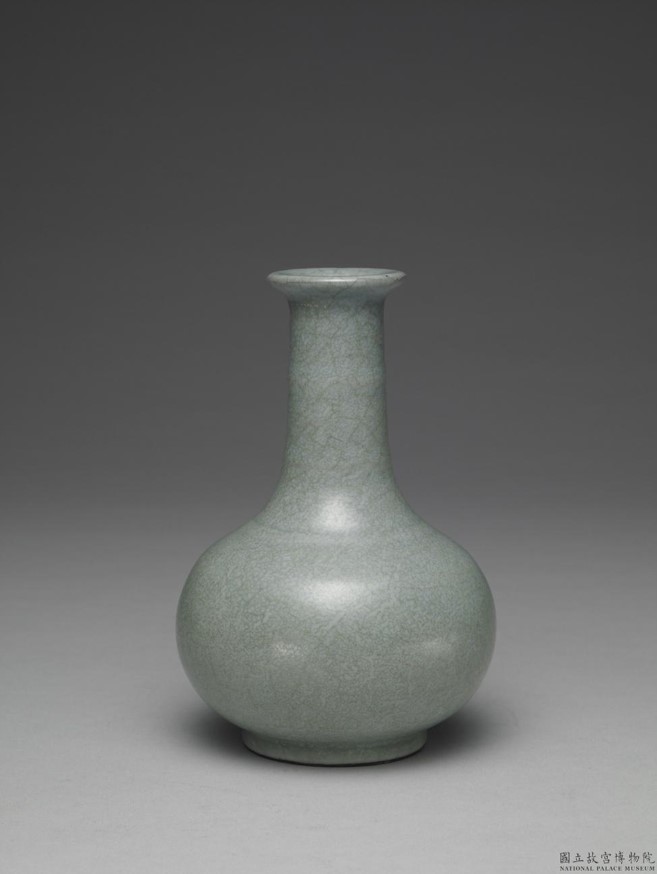 此器呈圓口窄邊,長頸,碩腹,平底,矮圈足。頸腹飾弦紋,因施青瓷厚釉,以致模糊難辨。釉表開細密淺色紋片,施釉至足際,足緣無釉,露胎處加塗灰黑色護胎汁。底面鐫刻乾隆皇帝〈詠官窯小瓶〉御製詩。詩末署「乾隆戊戌御題」紀年銘(乾隆四十三年,1778),並落「太璞」和「古香」兩枚鈐印。