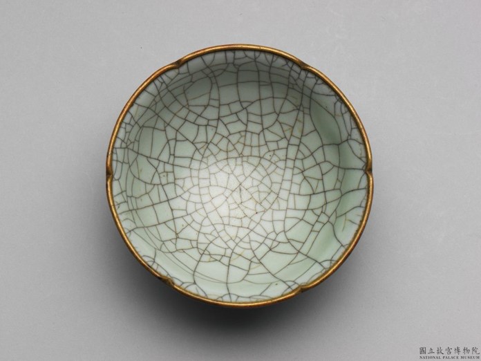 此器呈六瓣葵花口,深壁,圓底微凸,矮圈足,月白釉極腴潤。黑色小紋勻整清晰。口沿加鈐銅邊。對照圖冊所畫,而能得知銅釦於乾隆皇帝組合文物之際已存在。此器曾收入由乾隆皇帝主導,於乾隆五十五年(1790)組合名為《精陶韞古》典藏圖冊,現今所知傳世為乾隆皇帝主導、製作的圖冊,共有九冊,可知數量特別稀少。其中,能與圖冊對照者更為珍稀。此作整件作品的造形特徵,即繪入圖冊當中,益顯珍貴。
