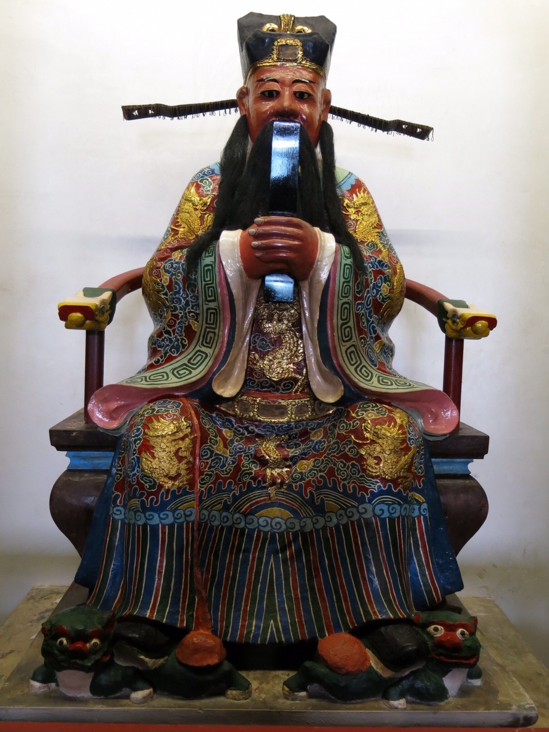紅面五絡綹長鬚,長及胸,為動物毛髮,頭戴展腳幞頭,深著金色寬袖蟒袍,袍上漆線金色龍紋凸出,漆線工藝粗糙,腰繫華帶,袍長至腳,腳著綠色靴,腳踩虎。整體神像坐於圈椅上,手舉至胸持鐵製笏。圈椅座兩側有「綁腿皮帶」「墨水瓶」等墨書。