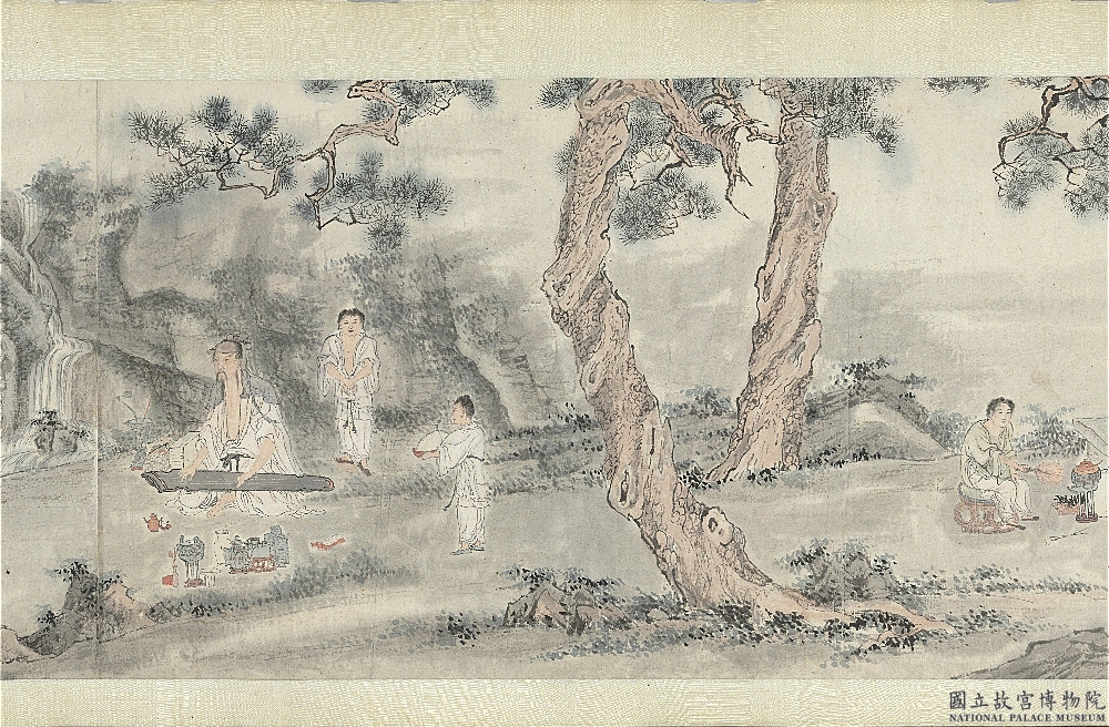 本卷繪琴士臨水撫琴,寄興於山水,旁側散置烹茶品茗與香爐鼎彝古物,閑適而塵慮滌盡。明代中、晚期,社會經濟發展蓬勃,文人尚古賞鑑與收藏風氣極盛,此即充分反映明代文人對山野間茶事與品香活,與愛好古物鑑賞之風雅興趣。
