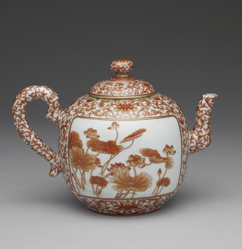 此器呈斂圓口,圓腹,弓形把,曲流,圓頂蓋,蓋側一通氣孔。通體礬紅描繪番蓮紋,器腹兩面開光,一面繪荷塘蓮花,一面書乾隆皇帝〈荷露烹茶〉御製詩。蓋足外壁塗金,內面滿施綠彩。器底有「大清乾隆年製」紅料篆書款。其造形與嘉慶朝瓷壺接近,推測可能為乾隆朝晚期之作。將此詩對照詩作之序,得以理解乾隆皇帝以為「水以輕為貴」,以及沏茶講究水質的原委,乃至乾隆皇帝喝茶所追尋的意境。透過御製詩的內容以及器上鈐印,可推知乾隆皇帝品茶的意趣,益顯珍貴。現今所知清宮傳世帶有乾隆皇帝御製詩的茶壺,數量稀少,本院收藏僅有此作與中瓷3315,益顯珍貴。
