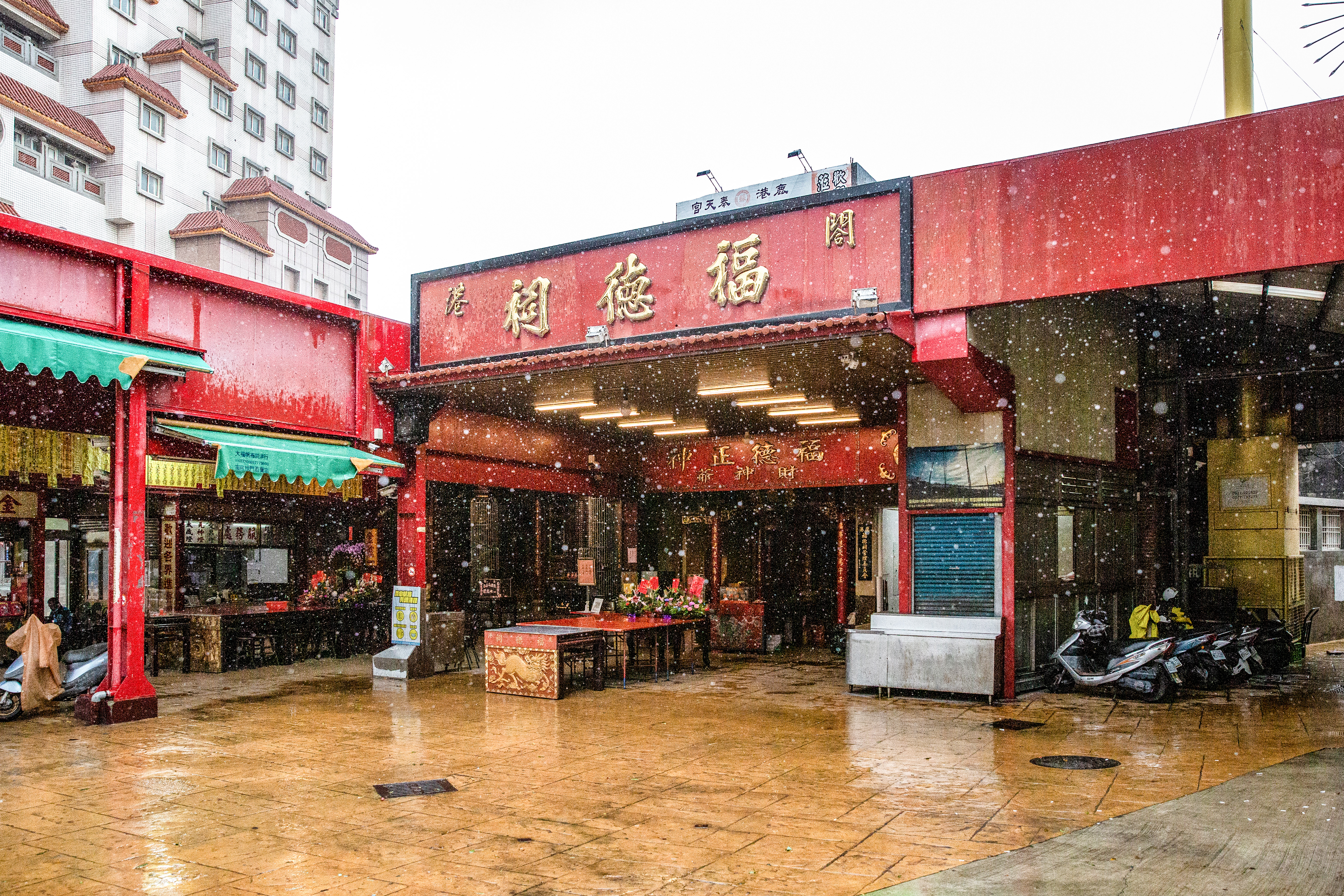 正殿為穿斗式屋架。神龕花罩人物、花草雕工精細,並懸一小「福德正神」匾,儼然如一縮小的室内空間。神龕中有大大小小十多尊鬍鬚冉冉,一團和氣的土地公像。神龕上懸光緒10年(西元1884年)重建時賜匾「含宏光大」。神龕兩側則為道光22年(西元1842年)的木對聯:「福緣善慶皆由德」「正直聰明是乃神」。虎爺為土地公的配祀,也是土地公的乘騎,神龕下方共有四尊形態各異之虎爺。