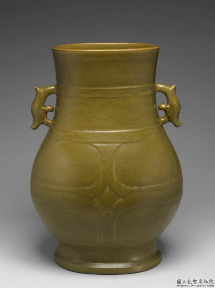 此器呈侈口直頸,雙獸形耳,碩腹,圈足外撇。全器施茶葉末釉,圈足露胎一圈塗鐵汁,足內及器內皆施釉。器身飾帶狀條紋,器底模印「大清乾隆年製」篆書款。對照《欽定大清會典則例》中,乾隆皇帝追述父親雍正皇帝重鑄古代青銅器時的說法:「皇考世宗憲皇帝時,考按經典範銅為器,頒之闕里,俾為世守」,一窺雍正官窯產燒如實仿燒銅器器形的可能背景。並且從中推想乾隆皇帝降旨仿效《考古圖》、《宣和博古圖》體例,編輯《西清古鑑》、《寧壽鑑古》和《西清續鑑》甲、乙編等青銅器圖錄,或許也可以將之看成是依循雍正皇帝而來的進一步發揮。此件作品臨仿銅器原型,再予局部調整,使之形塑出和青銅器不同的樣式。