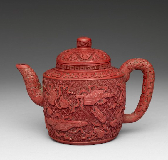 此器呈直口,折肩,圓腹,曲流,環把,圈足。除壺內、蓋內及底部外,全器髹朱漆數層,並予以剔雕。壺蓋飾如意紋,壺頸雕回文,壺肩與壺身,分別以如意卷草紋及雜寶紋環繞。蓋內、壺內及底部露出紫砂胎地,質地細膩,間有黑黃砂點。器底刻有「大清乾隆年製」金彩篆書款。