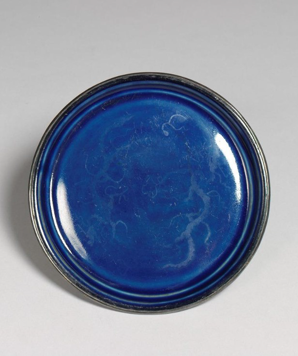 此盤呈敞口,窄沿,淺壁,平底,底部無釉,滿塗黃褐色護胎汁,口沿鑲銀釦,盤面飾雙龍戲珠紋。霽青釉是富含氧化鈷的藍色釉料,直接塗施胎面高溫燒成,色澤靛青如藍寶石,是元代新興的釉料,作品傳世者並不多見。霽青盤細長如蛇的龍紋特徵,相似於其它元代作品,唯雙龍同一器面者較為罕見。其霽青釉彩、金銀花貼飾,反映出元代之裝飾趣味。現今所知清宮傳世的元代霽青瓷器,數量稀少,本院收藏僅有此作與故瓷17371,益顯珍貴。