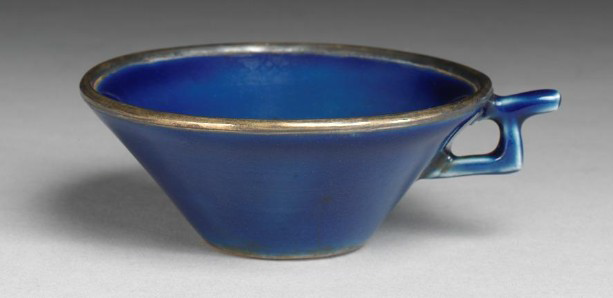 此單把杯身呈漏斗形狀,廣口、窄底,側邊有丁字形單把。杯內口沿及底心飾菱形方格紋、十二星芒團花紋,外壁環繞折枝梅紋。霽青釉是富含氧化鈷的藍色釉料,直接塗施胎面高溫燒成,色澤靛青如藍寶石,是元代新興的釉料,作品傳世者並不多見。現今所知清宮傳世的元代霽青瓷器,數量稀少,本院收藏僅有此作與故瓷17370,益顯珍貴。