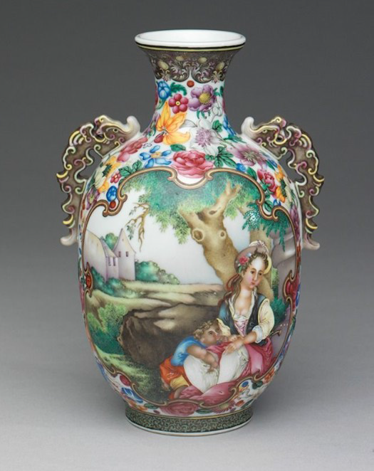 此器呈敞口,短頸,弧肩,長腹平底,肩部貼飾對稱螭形耳。口下與圈足外牆以黑色琺瑯料為地,加飾五色花果及綠色卷枝紋。器內與底部施白釉,腹部兩面開光內繪西洋仕女及孩童,並以田園風光作為背景;開光之外的隙地彩繪百花圖案。器底有「乾隆年製」藍料雙方框楷書款。此瓶因人物面容敷染細緻,眼鼻額唇勾勒清晰,並以立體明暗法渲染肌膚,加上背景圖畫近似西方油畫,令人產生西洋寫實風格影響的聯想。然而,器身兩側保留中國傳統作風的螭形耳,讓中西風格在此器物上完美的融合成一體。目前所知,該類製品全世界僅有二件(此件與故瓷17600),益顯珍貴。