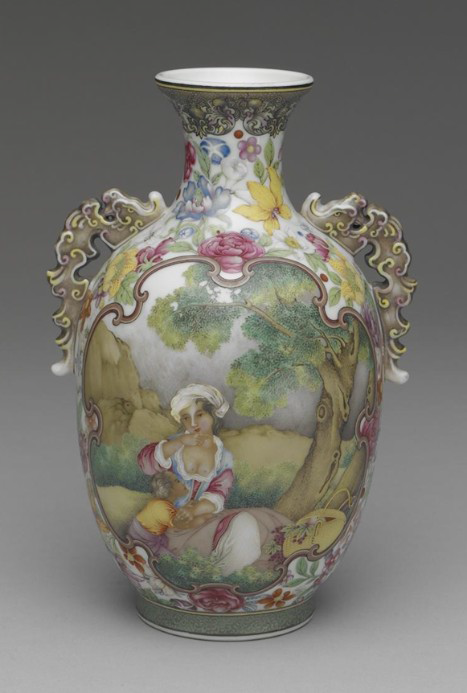 此器呈敞口,短頸,弧肩,長腹平底,肩部貼飾對稱螭形耳。口下與圈足外牆以黑色琺瑯料為地,加飾五色花果及綠色卷枝紋。器內與底部施白釉,腹部兩面開光內繪西洋仕女及孩童,並以田園風光作為背景;開光之外的隙地彩繪百花圖案。器底有「乾隆年製」藍料雙方框楷書款。此瓶因人物面容敷染細緻,眼鼻額唇勾勒清晰,並以立體明暗法渲染肌膚,加上背景圖畫近似西方油畫,令人產生西洋寫實風格影響的聯想。然而,器身兩側保留中國傳統作風的螭形耳,讓中西風格在此器物上完美的融合成一體。目前所知,該類製品全世界僅有二件(此件與故瓷17599),益顯珍貴。