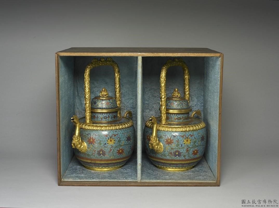 底刻「大清乾隆年製」六字款,是為御製之器,原收藏於養心殿。附有清宮楠木盒,上書「乾隆年製銅掐絲琺瑯提梁壺一對」,所用顏料可能是非常珍貴的佛青,其製作技法可能已經失傳。
