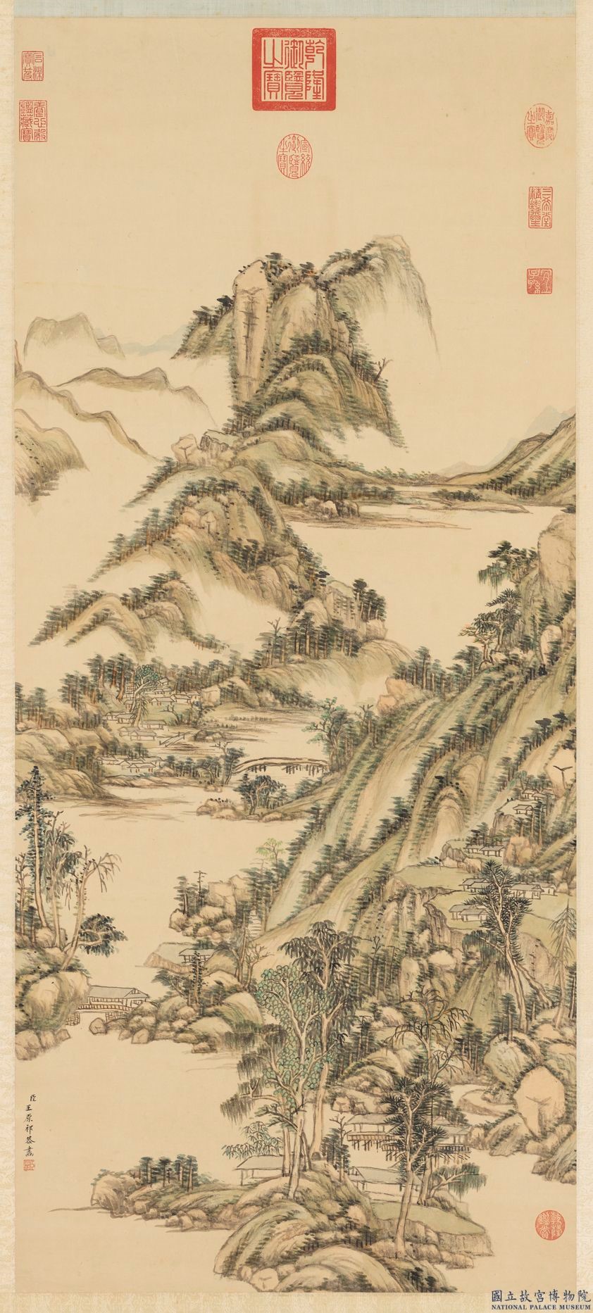 王原祁(1642-1715),江蘇太倉人,時敏之孫。字茂京,號麓臺,康熙九年進士,官至戶部侍郎。畫承家學,能超邁時倫,被尊為清四大家之一。 本幅前景是蓊鬱的樹林,幾棟水榭房舍掩映其中,一水貫穿整個畫面,小橋連繫兩岸,引人步入村中。湖山深曠,曲折中令人興起幽靜清遠之感。此作著重中遠景的山體推移,藉層層山脈疊加出遠闊的空間感,整體畫面籠罩在淺淡的綠色調中,更由於大量的留白運用於山體底部,透析出一股潔淨、輕動的情調。