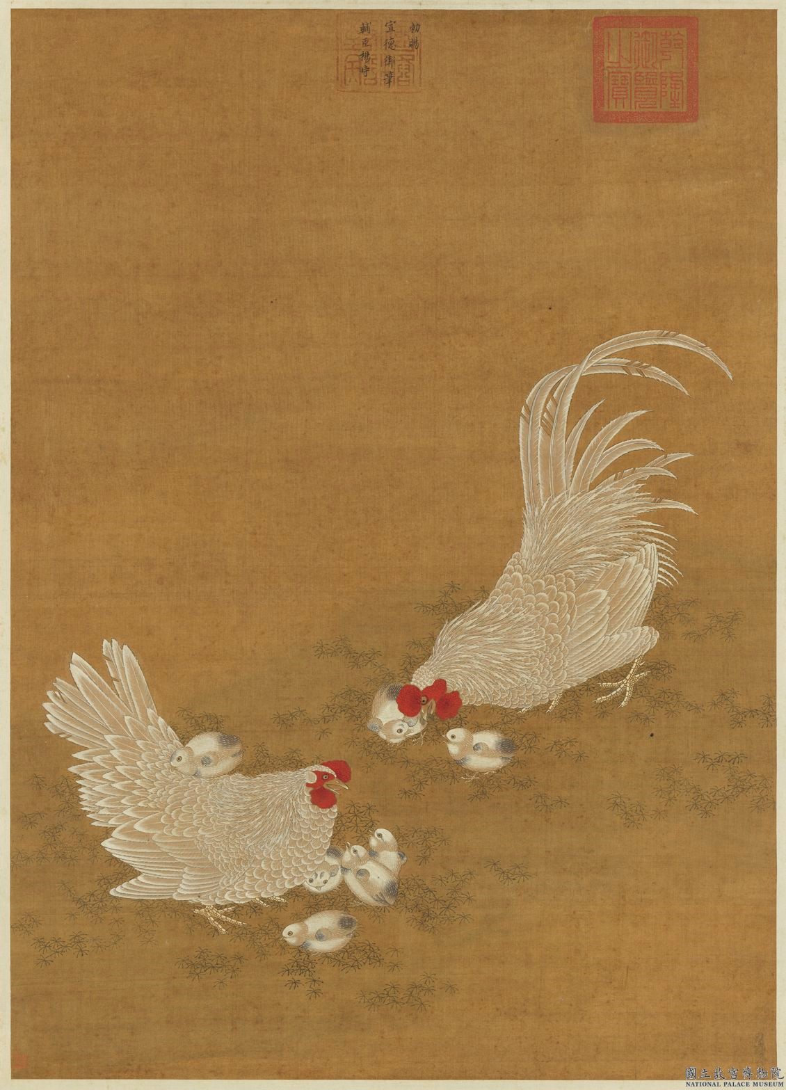 此幅畫公雞與母雞帶領幼雛在草地上覓食,呼哺育幼之情,躍然紙上。畫家取材日常生活,宣揚家庭倫理,具有教化功能。畫上署:「宣德御筆敕賜輔臣楊時」,並鈐「物格致知」一印。 明宣宗(1399 - 1435)姓朱,名瞻基,年號宣德,自號長春真人,是太祖曾孫,都北京。工書畫,山水、人物、花鳥、草蟲,往往與宣和爭勝。主政十年,締造了「仁宣之治」,以政績言,蓋非宋徽宗(1082-1135)之所能比。
