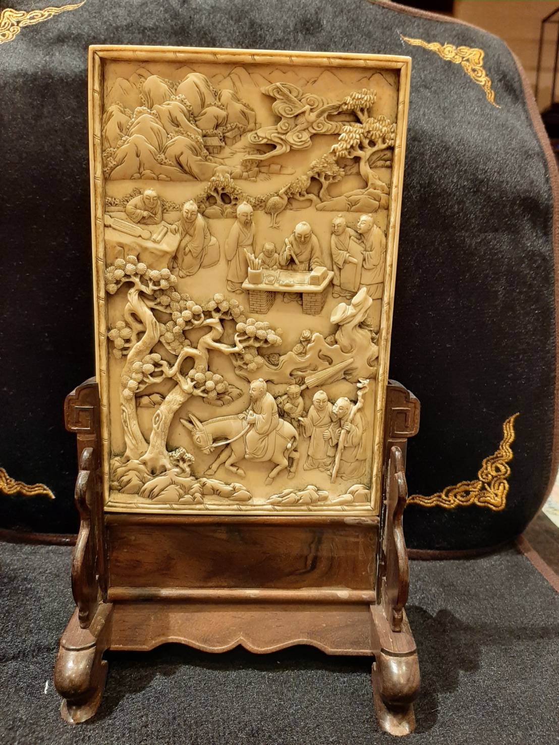 本件附有酸枝木插座,正面浮雕人物山水,背面淺刻和合二仙,有比賦七賢之意,具藝術價值。