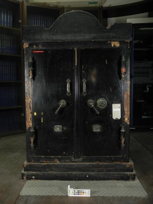 此物件為金屬製奉安櫃,全櫃⻑⽅體外型,漆塗⿊⾊漆料,由外⾄內設有三層雙⾨對 開。外觀正⾯上⽅有圓弧⼭牆裝飾,櫃⾨上各設有⼀⻑柄把手,把手下⽅設有⻑⽅形可左右移動之金屬板,板上有「TANARA、早川特製金屋」之字樣。右側⾨上中央設有圓形密碼旋鈕,密碼文字以日文片假名排列,左扇⾨的左上⽅貼有紅⾊壓印塑膠片,上頭印有「501030307/01」字樣。第二層⿊⾊櫃⾨上以金漆線條花草圖騰為⾨板裝飾,右側⾨扇中央設有鎖孔。第三層櫃⾨為⽊質,⾨上設有金⾊圓環⾨手,櫃內設有⼀抽屜。此奉安庫為放置教育勅語和昭和天皇夫妻之肖像照,只在重⼤節日或慶典才能取出,由學校校⻑親⾃宣讀。根據校友會成員陳永暉先⽣描述,戰後此奉安櫃改為存放學校重要檔案和金錢財產的保險箱,其父親因爲擔任在太平國⼩擔任總務工作時,負責保管該奉安櫃之密碼和鑰匙。