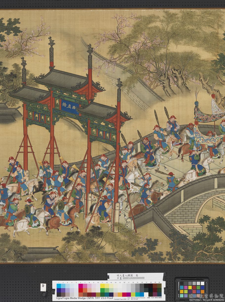 〈入蹕圖〉題名雖未明示畫中皇帝身份,然因場景記錄詳實,足以與史料對照,故可推定為明神宗(1573-1620在位)謁陵之紀錄。此作開啟大尺寸帝王巡行紀實繪畫的先驅,並充分展現神宗朝宮廷畫家對人物、場景、佈局各方面精湛畫技。