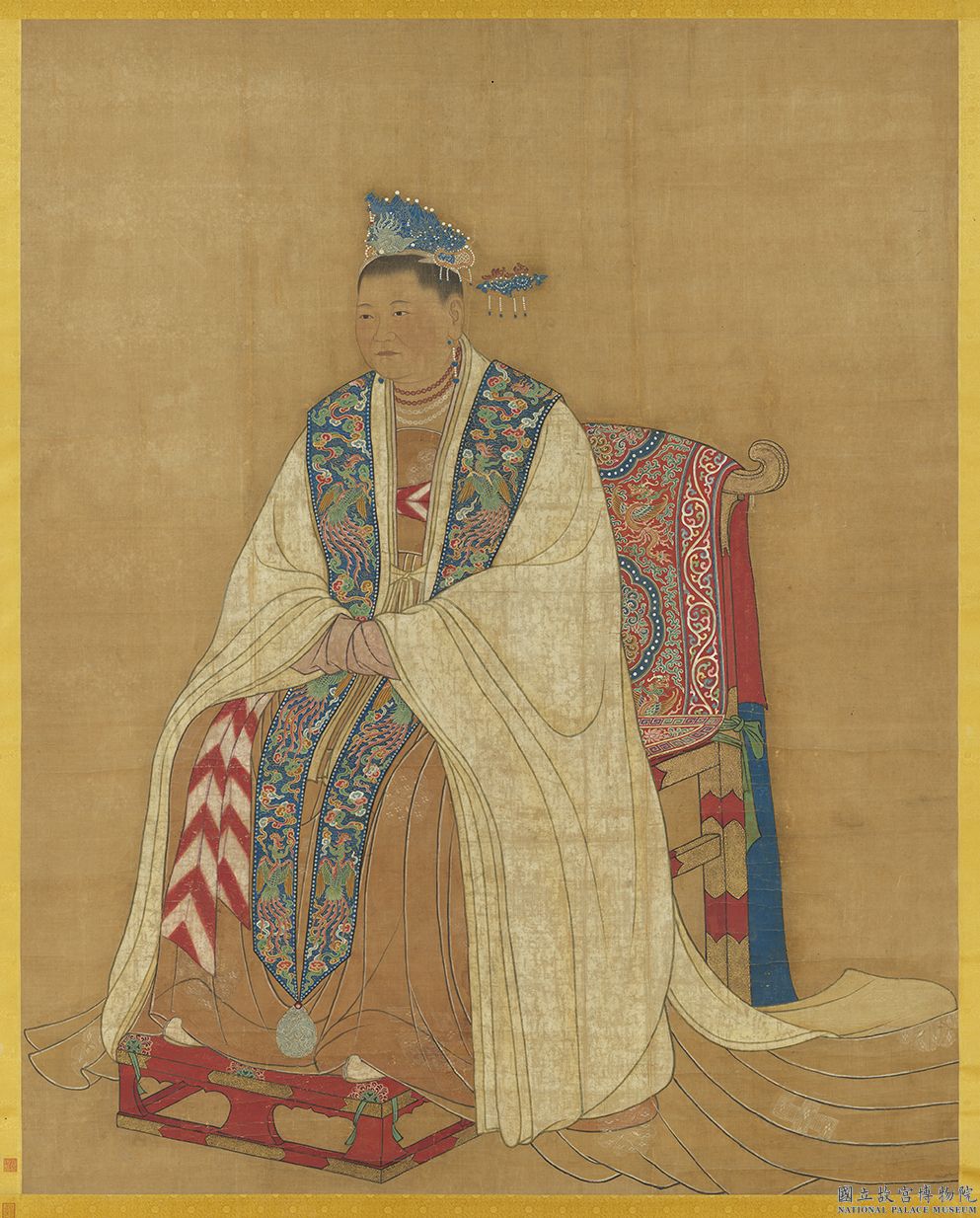 此作為存世唯一之宋宣祖后(902-961)全身像。由籤題標注「乾隆戊辰年重裝」及《南薰殿圖像考》等文獻資料可知,此像承自明代宮廷,並於乾隆十三年(1748)修復重裝後,貯存於南薰殿。畫作流傳有緒,為宋代貴族婦女裝束難得一見的珍貴畫作,可與宮廷奉祀儀典相互參照,極具歷史意義與研究價值。 本作描繪袍服、座具、椅披,均飾以複雜細膩圖案,繽紛悅目,代表宮廷畫家的高度成就。
