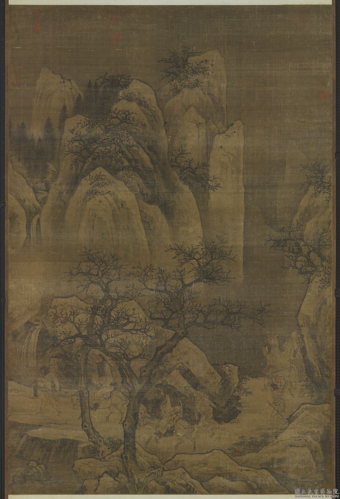 行旅是山水畫重要母題,從國立故宮博物院藏五代南唐趙幹〈江行初雪〉、北宋范寬〈谿山行旅圖〉等名作,即可見這類山水人物畫的繪製。 此畫呈現一群行旅或騎驢或牽騾、駱駝,在險峻的太行山徑趕路。人物縮頸彎腰及以袖口掩鼻,表情生動,顯露出隆冬的淒苦。