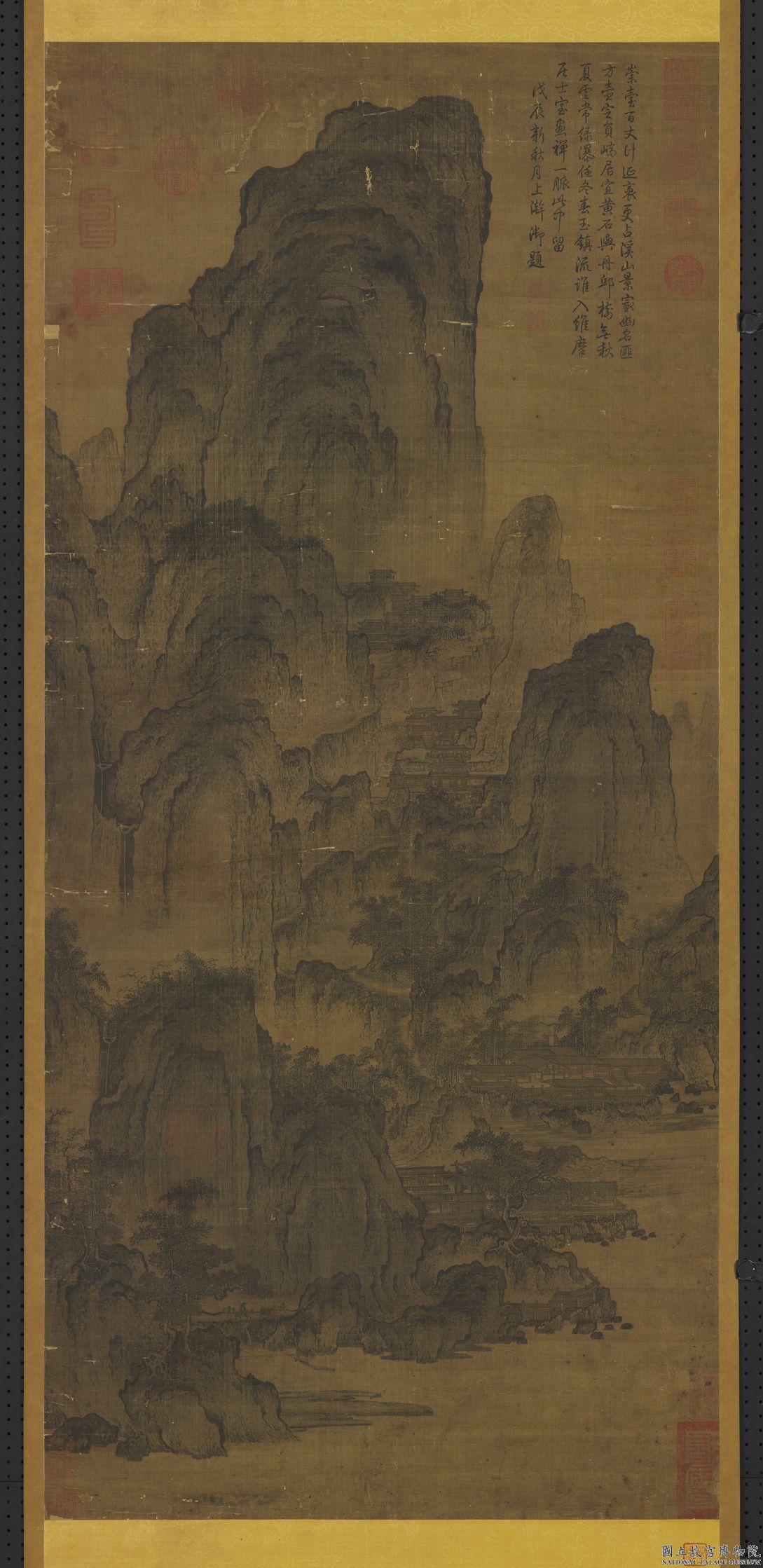 本幅立軸山水亦作巨嶂高壁,層巒重疊。山徑、行旅、樓觀、巨木穿插其間,刻畫入微,布置精巧,筆法細密,皆體現史料所載燕文貴畫風特色,然用筆較為圓潤,當為12-13世紀左右,燕文貴一系風格之衍流,也可佐證此類風格在宋元間的流變。