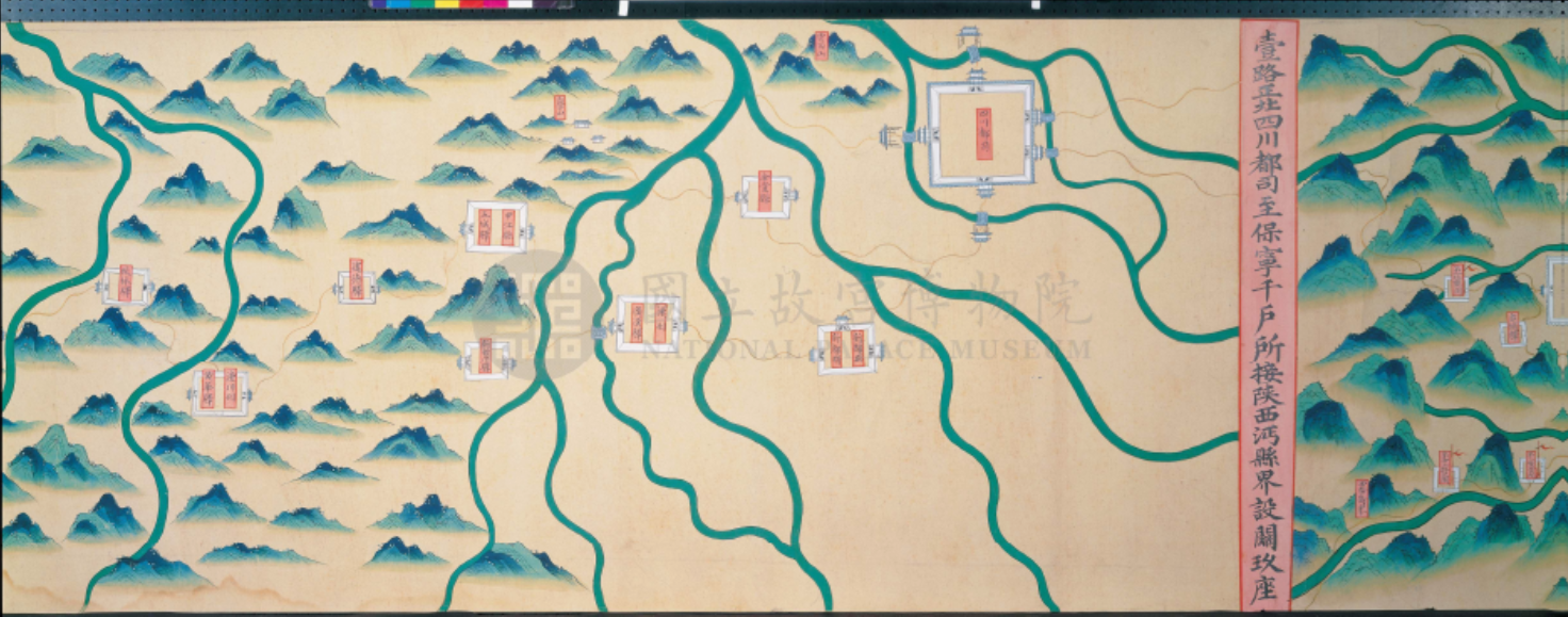 一、 本圖為卷裝,簽條題名:紙本彩畫諸司山川地理手卷。 二、 卷末有二張簽條,一是明黃色簽條記『四川地理圖』,另一簽條記『四川地理圖一卷』。 三、 狀況稍殘,全圖水漬嚴重,破損、霉斑、污漬、折痕多,有蟲蛀痕跡。
