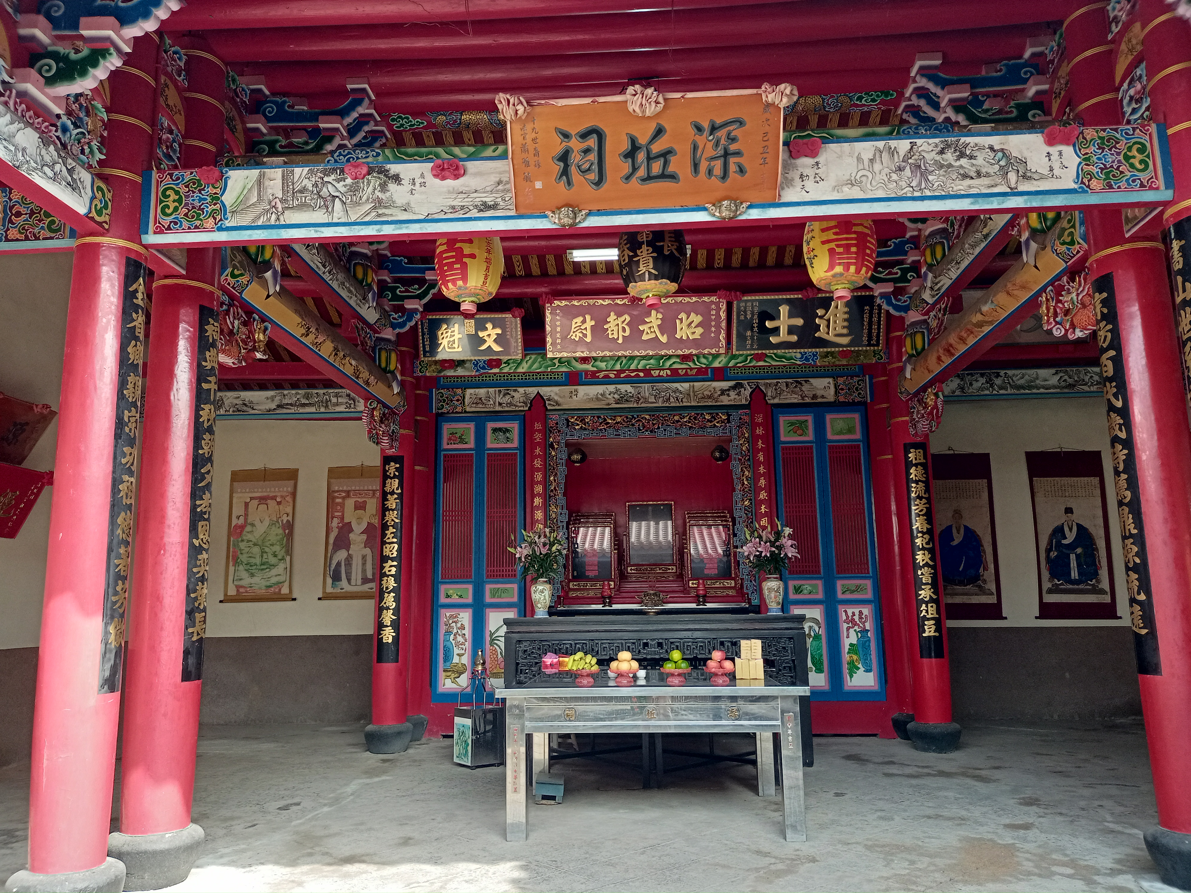 社頭深坵祠一進三川殿右邊牆面展示深坵祠相關沿革歷史與中國本家建築等相關資訊,二進正廳以祭祀為主,設置有公媽龕和花罩構件,龕內祀奉「書山」派下第六世祖蕭仕鼎公以降歷代祖先之牌位;左右護龍分別是辦公室、會議空間、儲藏空間等,本體未有居住使用,性質較為單純。 進入前廳大門後可見抬樑式棟架,使用二根通樑及三個瓜筒,形成三角形棟架,俗稱「二通三瓜」,另廳堂樑柱均為建造時之原建物,更顯珍貴。祭祀器物、祖先畫像、古文書與神龕仍多所保存。