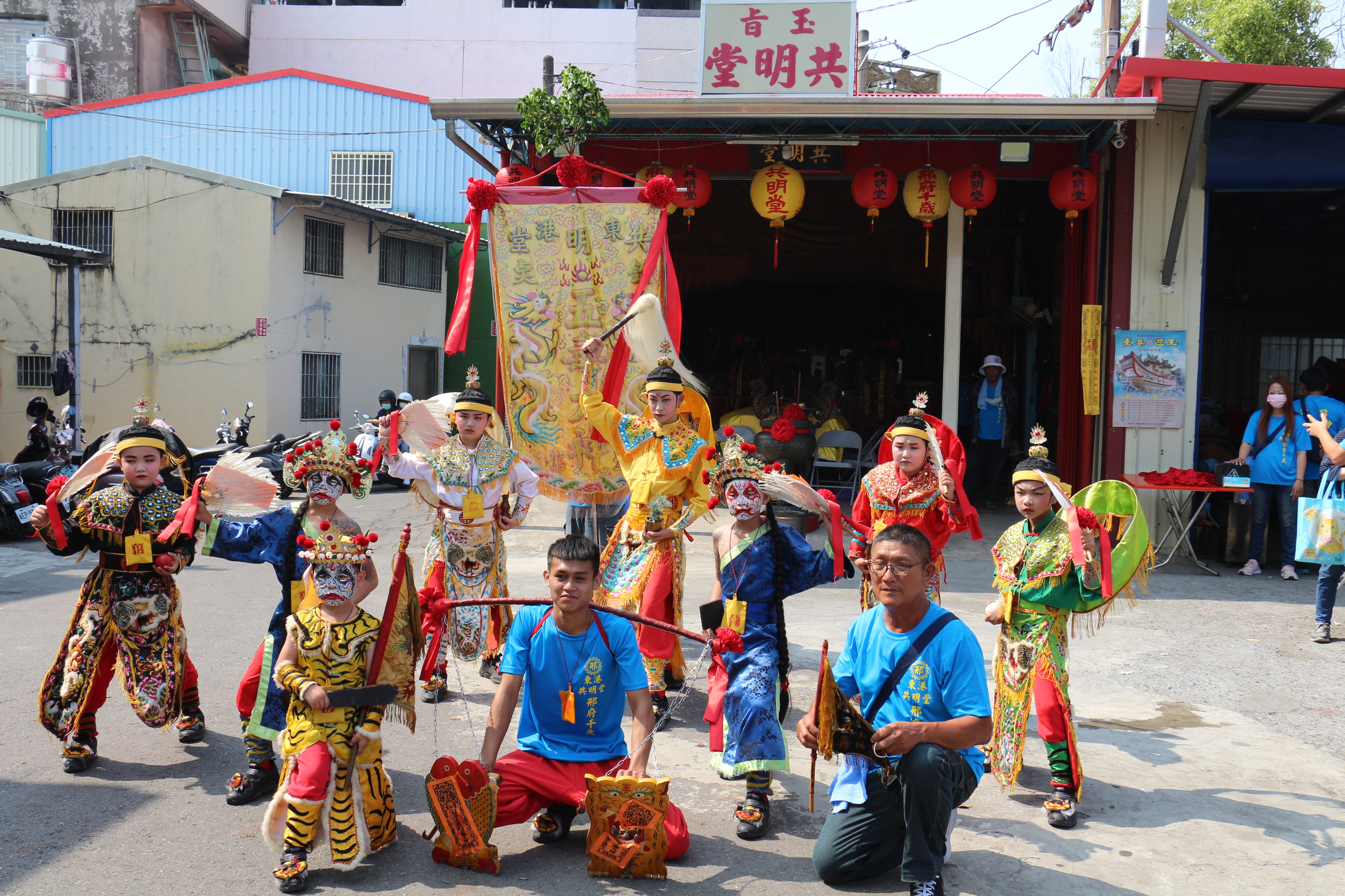 1.起源 共明堂位於屏東縣東港鎮盛漁里,主祀邢府千歲。「東港共明堂欽點五毒大神」在東港地區以邢王系統廟宇為主(自臺南傳來),1982年共明堂內的邢府千歲分靈至東港共心堂。而共明堂五毒大神陣於1985年成立。 2.發展狀況 「東港共明堂欽點五毒大神」為9人陣,除刑具爺以外,其餘8人皆為7歲至13歲小孩所裝扮,附屬於共明堂。此陣頭為配合東港迎王平安祭典所成立的傳統陣頭,自1985年來首次參加東港迎王平安祭典之後,至今已38年。此陣頭原僅在東港迎王平安祭典出陣,但隨著東港王爺信仰的擴散,也流傳至小琉球及屏東市一帶。為推動陣頭發展,東港共明堂成立屏東縣東港鎮五毒大神文化發展協會,成員大都是裝扮過五毒大神的人員為主,主要是負責五毒大神的招募及訓練,協助推動保存維護工作,除1985至2020年間參加「東港迎王平安祭典」之外,也曾參加過1997年「東港打臉的歲月活動」、2015年「東隆宮文化部陣出轎起活動」、2021年「文化部西港有藝無疫,齊來看戲活動」,以及「東港蝦米媽祖」等慶典遶境。 3.相關傳說 五毒大神的傳說與由來,有一說為得道升天的五福大帝各留一魂魄於井內,玉皇上帝深怕留於井內的魂魄作亂,擾亂民間。請道法學成的劉部宣靈公下凡,將遺留井內的魂魄收回於天庭後,玉皇上帝則將其魂魄冊封為「欽點」五毒大神,職責為收除瘟疫。故五毒大神並無金身,也不屬於任何神明之駕前部將。只有地方平安祭典遶境時,懇請劉部宣靈公向玉皇上帝請旨,並安五毒大神之座位,再由劉部宣靈公帶領下凡,為地方驅除瘟疫。另一說為5名孩童,因看見鬼怪於水井下毒,5名孩童擔心大人不信此事便自投水井示警,死後受玉皇大帝憐憫,特封賜「欽點五毒大神」為五毒大神。由於五毒大神生前為村童,所以裝扮成員亦由6至11歲兒童擔任。五毒大神是五位7~13歲之小孩,因見疫鬼放瘟於井水中,擔心大人不信,於是跳井示警。後受玉帝憐憫,欽點為五毒大神;另請天皇都劉府千歲為其監護人,邢府大千歲派其駕前文將軍擔任陣前將軍,邢府三千歲又派金銀二將,分立陣頭前两邊,擔任護駕將軍,再加上刑具將軍共計九員,形成五毒大神之陣頭。