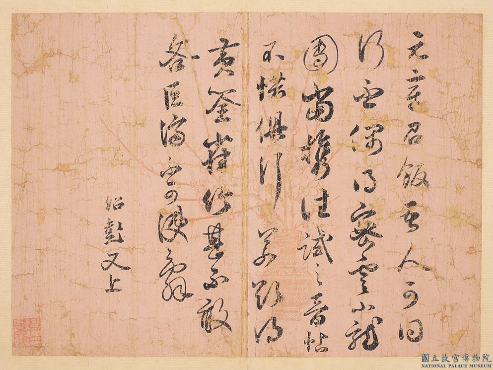 薛紹彭,宋神宗時(1048-1085)人,字道祖,號翠微居士。時以翰墨名世,善品評鑑賞,工楷、行、草書,筆致清潤遒麗,具晉、唐人法度,齊名米芾,人稱「米薛」。鑑賞上與米芾、劉涇為友,朝夕議論晉唐名蹟。 本幅書寫紙張為砑花粉箋,許多部分已剝落,圖案可清楚看出為青銅紋飾瓶子上插有數枝梅花,顯得高古幽雅,與信中所提小龍團茶餅、書畫等雅事相呼應,從書法到紙張都可感受到賞鑑家閒情雅致與幽古情懷。