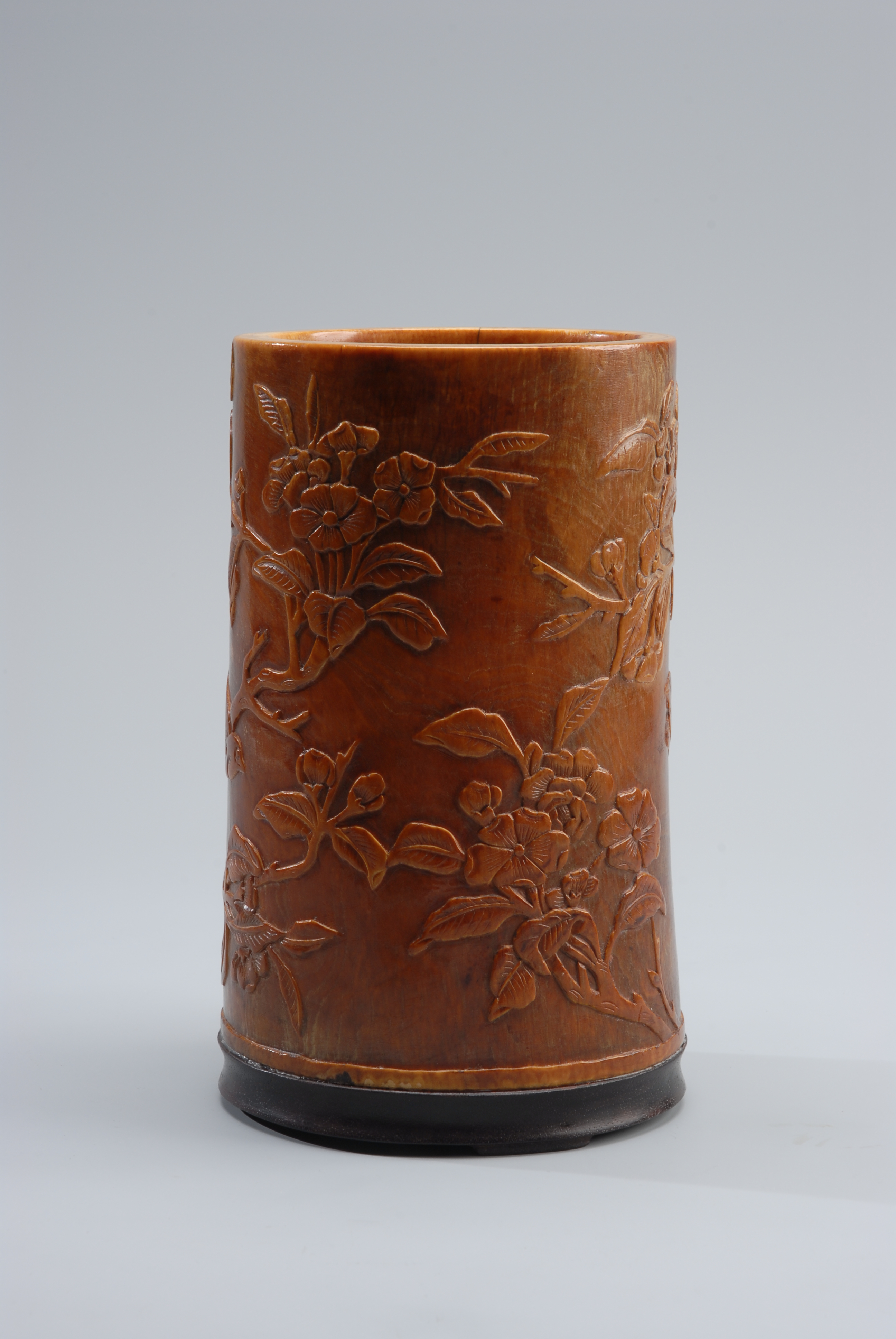 本件筆筒取一段象牙採淺浮雕技法雕刻而成。底部起一寬線,並以老紅木套座當底口。由於年代久遠,牙質呈現泛金黃,皮殼亮麗滑潤。通體滿工雕刻,上面佈滿搖曳生姿的花葉枝幹,及栩栩如生、姿態各異的喜鵲;花瓣、葉片脈絡清晰,靈活呈現大自然原貌。