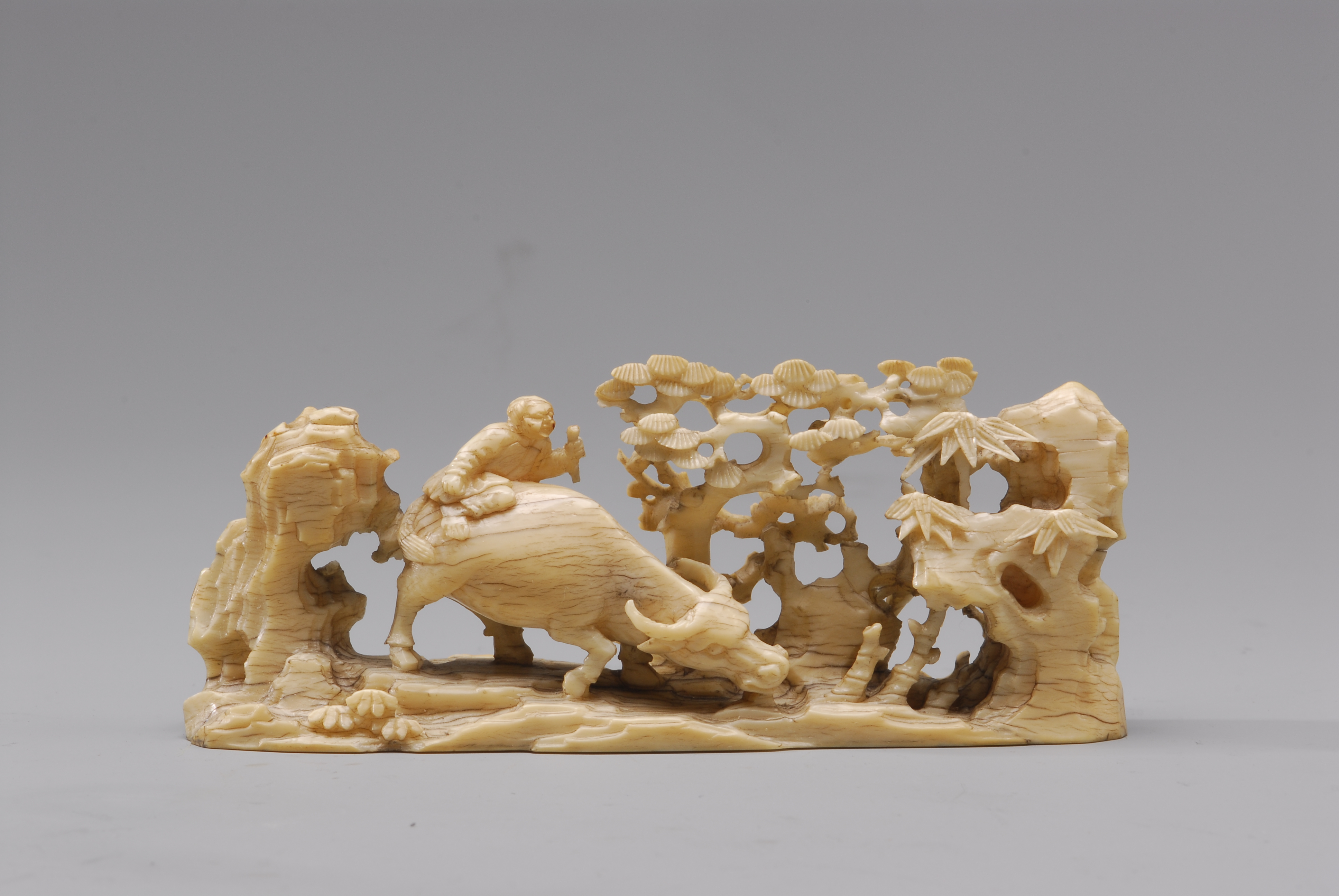 本件筆山選用中段厚實大牙雕鏤而成,以牧童騎牛牧歸為紋飾主題,動態自然傳神。松竹蓬勃並茂,石景崢嶸嶙峋,可見其布局精妙、構圖嚴謹。