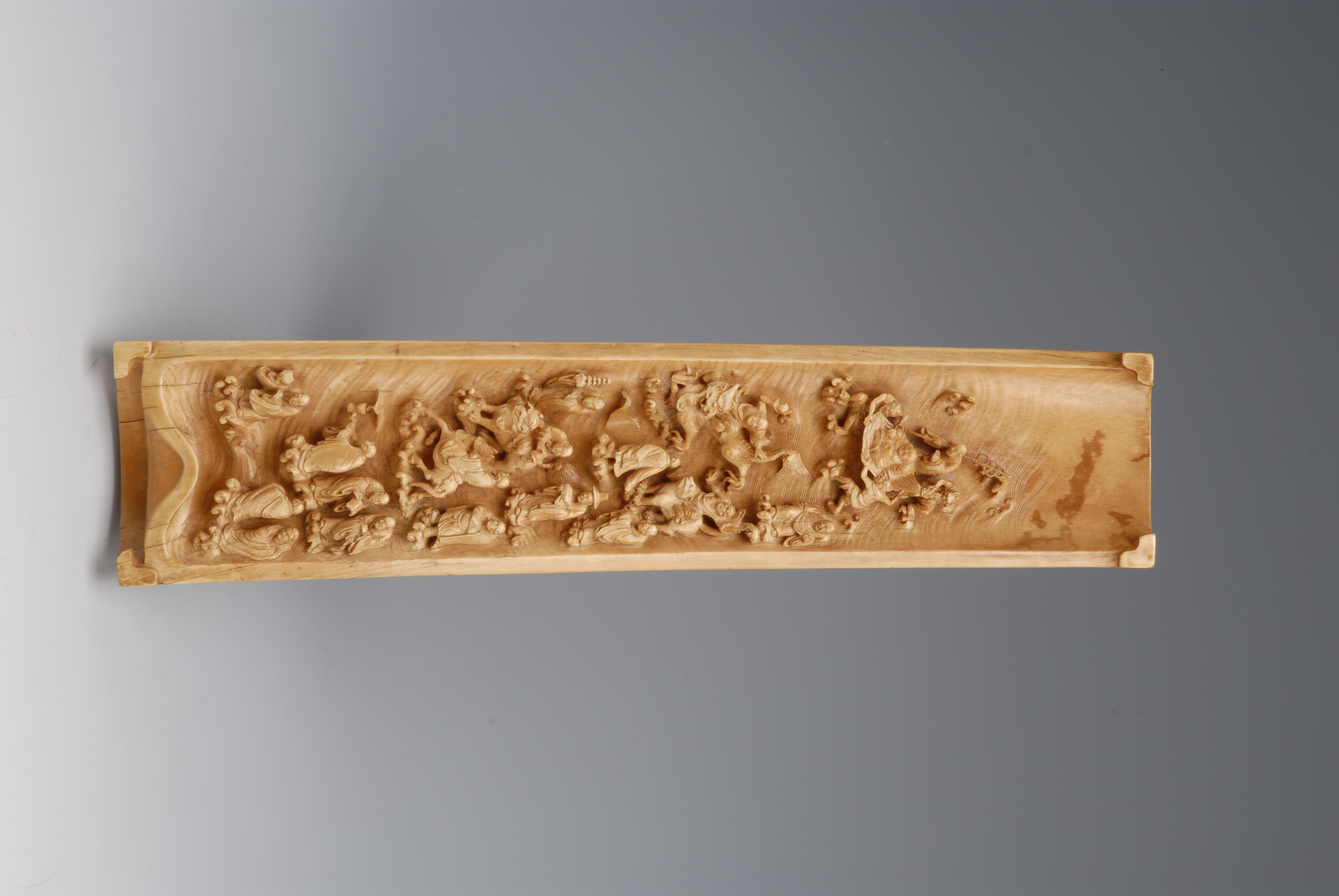 本件牙雕臂擱上窄下寬,呈覆瓦式,採象牙一段剖開而成。通體雕竹節形,四角分飾四矮足。正面雕海水行舟,背面凹槽「陷地陽刻」十八羅漢渡海圖。