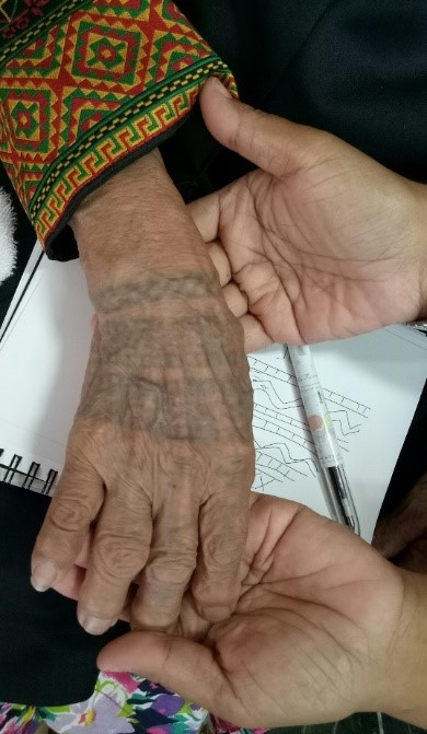 1.儀式過程1或第一天(如何籌備與籌備所使用的器物或材料、儀式過程、儀式特色) 手紋的前置作業就如同籌辦結婚儀式一樣,被紋手少女的家人必須先準備充足的食物,父親和家中的男人會上山去砍柴;家中則需準備鐵鍋(palungu)、阿拜(abai)、琉璃珠戒指或單顆琉璃珠(silu:黃色和橘色珠),贈與刺紋者。 2.儀式過程2或第二天(如何籌備與籌備所使用的器物或材料、儀式過程、儀式特色) 紋手的時間通常選在寒冷而農閒的冬天,場所則選在受紋者住屋外搭建的臨時小屋。紋手的方法是以柑橘類或薔薇科的刺,綁在竹枝上,以小槌子、刀柄或木片打入手背事先畫好的圖紋處。當血水滲出時,會先以乾淨布料擦拭,再以鍋底煙灰或小米梗經過烈火焚燒成黑灰的灰屑塗抹於手紋,形成灰黑色的紋路。刺紋的過程中,同樣的圖紋會來回刺四至五次。 3.儀式過程3或第三天(如何籌備與籌備所使用的器物或材料、儀式過程、儀式特色) 被紋手的少女結束紋手後,需要在家中休養一個月左右。手紋疼痛或結痂皮膚發癢時,可將手靠在冷卻的鐵鍋止癢,以減輕疼痛感或搔癢感。或是可將龍葵(amici)的莖葉搗爛,外敷在腫脹的傷口或皮膚上,加速患部消腫。此外,有些家族則是讓少女雙手放在胸前靜置不動,保持傷口的乾燥,讓傷口自然復原。