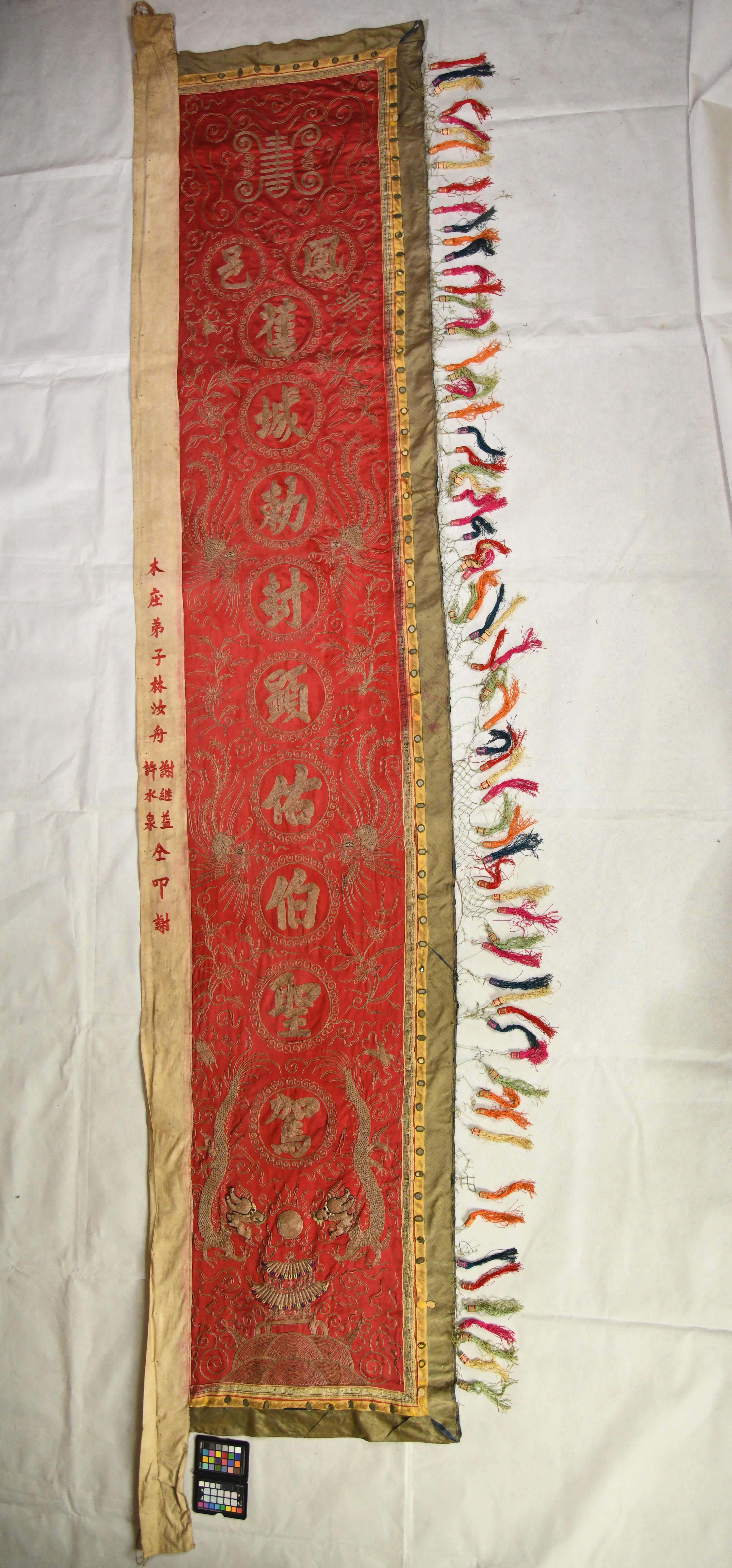 1. 見證城隍信仰圈及出巡遶境之織品類文物,呈顯城隍廟信仰民間化的意義。 2. 蔥繡法精細,具相當藝術造詣。