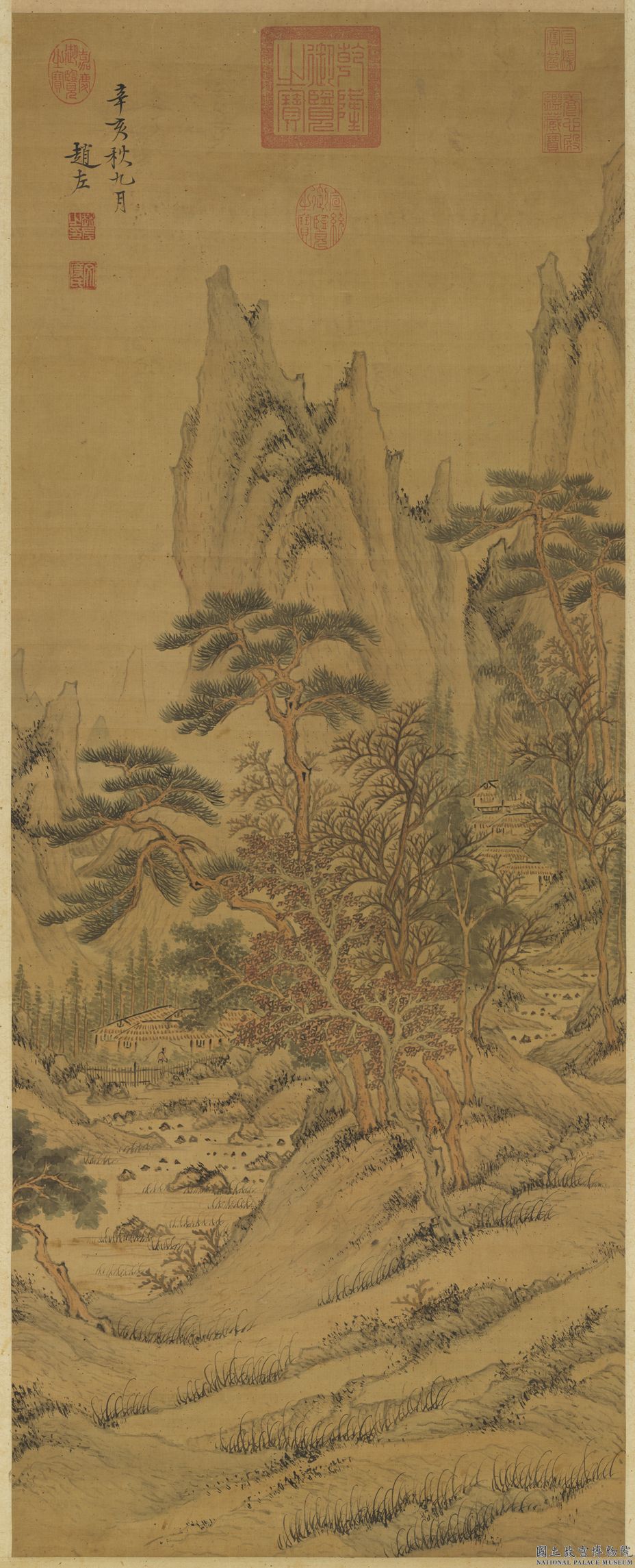 趙左(約1570-1633後),字文度,善畫山水,蘇松畫派首創人。董其昌(1555-1636)極肯定畫藝,常為董氏代筆,是松江派代表畫家之一。 畫中趙左自題「仿唐人楊升畫」。據載楊昇(升)畫山水得張僧繇(活動於6世紀前半)沒骨法之妙。畫深秋紅樹,山頭樹稍已覆蓋薄雪,點葉生動自然。 此作多用青綠設色,山石不用皴紋,而以沒骨法漬染,尤其在高峰右半漸漸消失於雲霧中,色彩搭配具光影明暗變化,將畫面烘托的極有氣氛,頗有唐畫山水遺風。