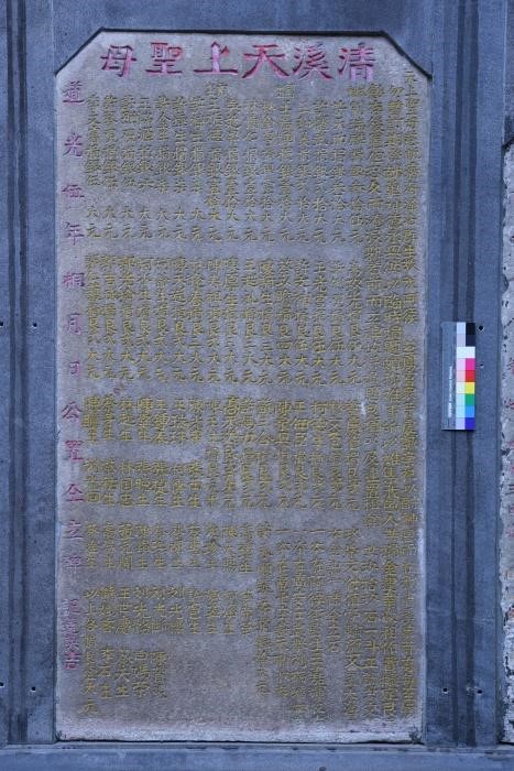 1.完成年代與沿革簡述 此碑立於1825年(清道光5年),放置於屏東市慈鳳宮。屏東市慈鳳宮主祀天上聖母,1825年(清道光5年)來屏東移墾的泉州府安縣人因有感念天上聖母庇護,於是發起募集資金、建業收費,以做祭祀用。但恐年久湮沒,而立此碑詳列捐題銀項與建置租額,以垂永久。 2.與文物相關的重要人物 媽祖亦稱天上聖母、天后、天后娘娘、天妃、天妃娘娘、湄洲娘媽等,一般人皆尊稱媽祖。媽祖為福建莆田縣湄洲島人,生於宋太祖960年(宋建隆元年)3月23日。因出生時不聞哭啼聲,名為林默娘。16歲時能通曉變化,妙用玄機。驅邪治病、濟世活人,能呼風喚雨。林默娘常於大海狂瀾,救護難船。28歲時,父兄同出航海,突遇風浪,林默娘赴海救父兄,然而兄生還父卻不幸遇難。林默娘遂於大海遍尋父屍,三日負屍而歸。同年9月9日,端坐山頭而遷化。里人感其恩德,將其肉身立廟奉祀。羽化後常顯威靈,香火不絕。林默娘又常於海上顯聖救難,為各地航海人士奉為聖神,尊稱為媽祖 。 3.古物尺寸(長、寬、高等)與材質 「屏東市慈鳳宮清溪天上聖母碑」碑高134.6公分、碑寬69.7公分,材質為花崗石(泉州白石)。 4.外觀特徵描述 「屏東市慈鳳宮清溪天上聖母碑」碑體有損傷、剝落,字跡損傷,掉漆、剝落的狀況,不易辨識的字體有4個。原碑無題,額刻紅色字體「清溪天上聖母」6字,碑文則為金色字體。碑碣刻字為:「天上聖母,慈帆濟海,澤沾羣生;故我阿猴慈鳳宮眾等虔誠崇祀,以酧神恩。而在我清溪眾等,有每至處□勿替,訂期祭献,冀神德永生。 然以臨時捐題頗稱難事,所以雄集我邑人等,捐金建業,收租作費,擬定良□,餘存後置;但恐久而淹沒,孰若前而立碑?故將捐題艮項,以及建置租額,共玖拾玖石一斗正,計共文□九帋,交付值炉輪流;又置大簿三本登記一樣,仝立石。一本在阿候街監生王嘉輝收存,一本在廣安庄武舉劉瑞麟收存,一本在龜屯庄許天助收存。 武魁劉瑞麟捐銀叁拾大元。許耀武捐銀弍拾大元、王和美捐銀弍拾大元。監生王嘉輝捐銀壹拾大元、林金亨捐銀壹拾大元、林懷仁捐銀壹拾大元、吳廷昇捐銀壹拾大元、貢生王振德捐銀壹拾大元。 許梓生捐銀柒大元、許燕生捐銀柒大元、許金生捐銀柒大元。王協源捐銀六大元。許照觀捐銀伍大元、許琴觀捐銀伍大元、李文富捐銀伍大元、高玫光捐艮伍大元、許俐觀捐艮伍大元、王光宮捐艮伍大元、許文補捐艮伍大元。蔡大贍捐艮四大元。陳騎生捐艮三大元、王超禮捐艮三大元、陳厚生捐艮三大元。陳壽祖捐艮弍大元。林逢春捐艮三大元。陳天送捐艮弍大元、柯爺生捐艮弍大元、河水生捐艮弍大元、郭光掄捐艮弍大元、郭吉成捐艮弍大元、郭仁護捐艮弍大元、許慶自捐艮弍元、林文苞捐艮弍元、柯德生捐艮弍元、王佃臣捐艮弍元、陳泉興捐艮弍元、蘇三合捐艮弍元、許媽力捐艮弍元、高天送銀弍元大元。陳王生捐艮一元半。 陳光串、王瑞珠、王鍾泰、陳堂生、林越生、蔡茅生、陳贍生、張兩生、柯傳生、張捷生、張晚生、林國忠、蔡祐生、劉光回、高瓊生、陳天賜、沈珍生、蔡惠生、蔡胡生、蔡琛生、陳□生、董元鬧、高得生、蔡唫生、蔡榮華、柯溪生、陳孟生、許苞生、劉光標、劉光斷、劉光務、王世慶、蔡媽吝、陳賀觀、白媽榮、蔡天生、李石生,以上各捐艮壹大元。 許永順號添捐艮拾大元。 道光伍年桐月 日,公置仝立碑記,蓮英吉。」