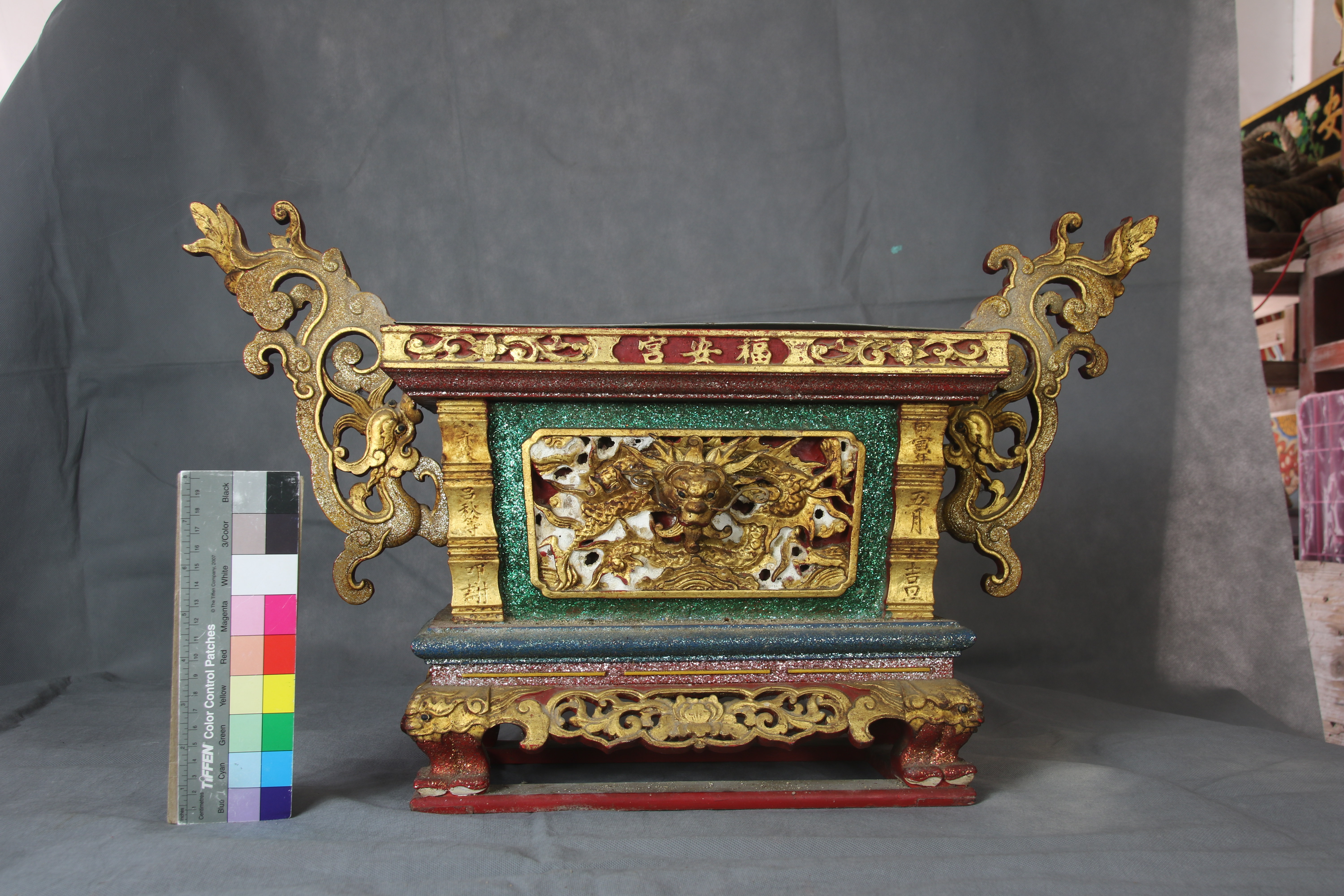 1、展耳木方爐,橫刻「福安宮」,上款「甲寅年五月吉旦」、「小赤崁呂秋等叩謝」。展耳祥龍捲草紋,正面中央盤龍紋,兩側竹節刻款,施金蔥,有姬峰築巢痕跡,四足螭虎吞腳。 2、從木香爐造型風格,甲寅年可能為1854年或1914年,再根據鎮海福安宮廟外石柱落款有「昭和七年壬申年葭月吉置」、「小赤崁弟子呂秋等敬献」的資訊,推測這兩處呂秋等為同人,呂秋等應為白沙小赤崁人,於1914至1931年間活耀於小赤崁,並積極參與鎮海福安宮的交陪活動,本件香爐當屬為1914年所雕刻,本件香爐見證兩村於此時的交陪情況。