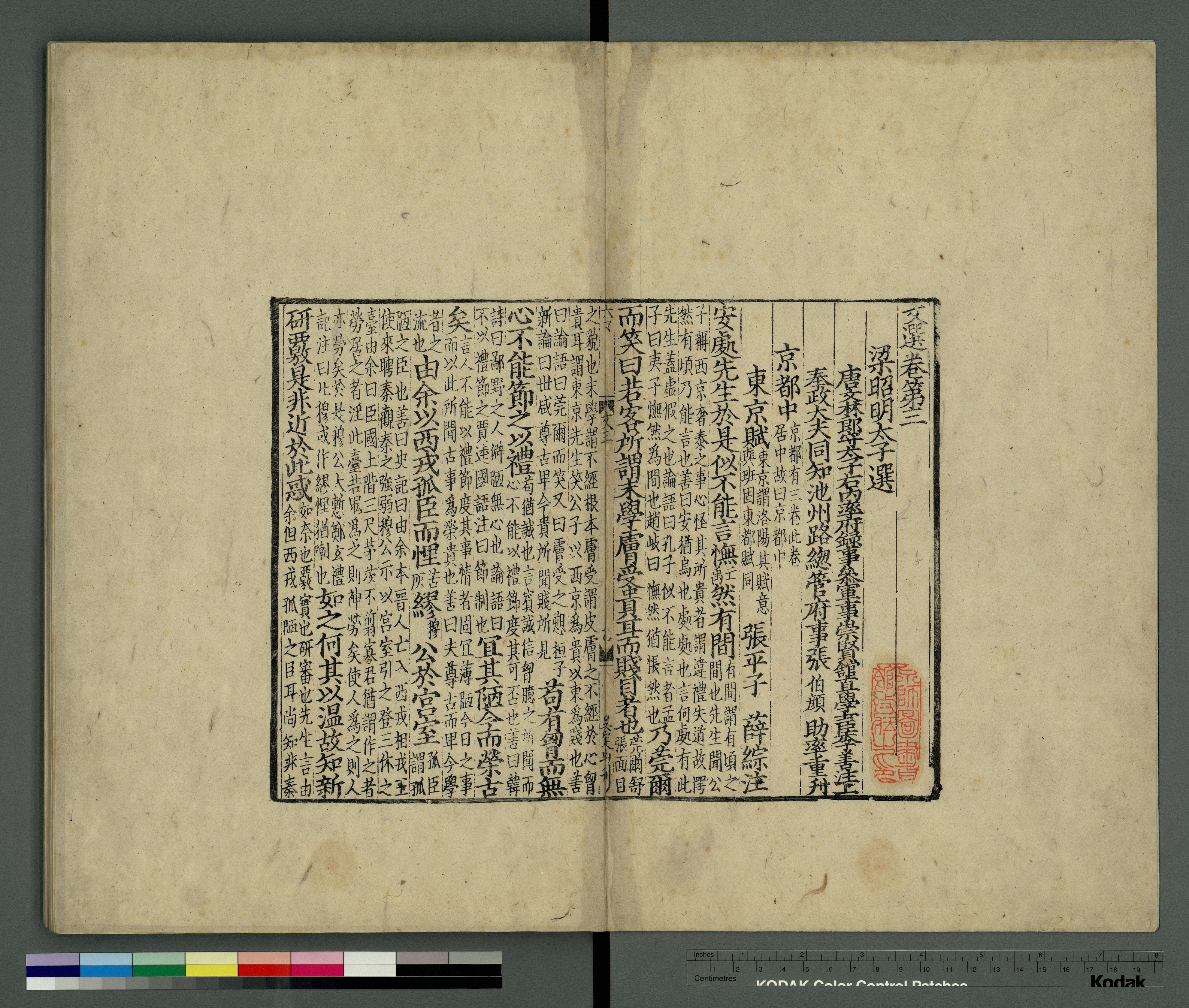 《文選》屢經雕印,約可分為李善注、五臣注、六家(臣)注系統。目前考知元代《文選》刻本僅二種,即大德茶陵本與延祐張伯顏本,前者屬贛州本系統,後者源出南宋尤袤校刊之李善注系統。 池州舊時即昭明太子封邑,境內留有多處相關古蹟。元大德九年(1305),池州曾新刻《文選》,十餘年後板片燼毀;延祐七年(1320),張伯顏出任池州路同知,乃捐貲主持重刻。明代唐藩、汪諒、晉藩、汲古閣之翻刻本,皆出自張伯顏本系統。此帙書冊寬大,保留蝴蝶裝舊式,框外紙幅留白甚闊,紙墨勻潔,品相尚佳。