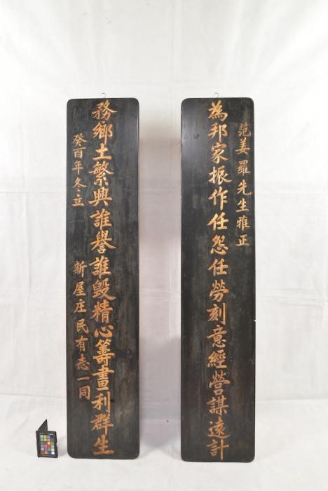 范姜羅擔任新屋庄長時,曾爭取總督府補助沿海造防風林,開闢旱地種植甘蔗,並將自己產業提供給佃農試種蓬莱米,貢獻很大,故在昭和8年(1933)退職時,新屋庄民一同題贈楹聯,讚頌其政績。原存於范姜羅自宅,後捐贈給宗祠,懸掛祖堂牆上,用以光耀門楣並彰顯祖德。上款「范姜羅先生雅正」;上聯「為邦家振作任怨任勞刻意經營謀遠計」;下聯「務鄉土繁興誰譽誰毀精心籌畫立群生」;下款「癸酉年冬立 新屋庄民有志一同」。該楹聯外觀呈狹長形,係以一整塊長方形木板裁切製作而成。聯面施黑漆,斜切鉤邊文字並內填金漆,此聯的背面有與正面刻劃相同的字體,上聯背後是下聯,下聯背後則是上聯,背面文字刻劃處未上漆,應是後人所刻,其用意尚不得而知。