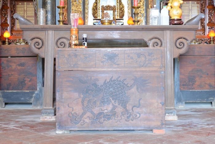 本木裙桌桌面使用硬度高之烏心石木拼板而成,木裙板則以細緻之臺灣肖楠為基底材,採用「淺雕填彩」技法代替墨繪,透過木板表面紋飾之事先淺刻,再填入生漆或乾漆,乾後磨平,展現漆藝之技術與特色,可強化漆繪圖案之牢固度與紋飾對比,是目前少見的桌案製作工藝,是一張足證日治大溪特有的填漆工藝作品。上簾以墨線畫成三大方格,中間畫橫貫靈芝的三彎腿香几,几上擺蔬果作清供;左右兩側方格各畫藍雀與梅雀圖。下帷部分則以墨線勾勒大方框,框內墨繪祥獸麒麟回首圖,四腳分別腳踏寶瓶、蒲葉、方勝和如意等八寶吉祥圖。立面中央上方「始祖呂萬春公」,即昭示呂萬春為呂姓族人之開閩始祖;上款墨書「大正八年己未仲冬之月吉旦立」即大正 8 年(1919)農曆 11 月安置;下款墨書「八房祀名裔孫等仝永祀」。