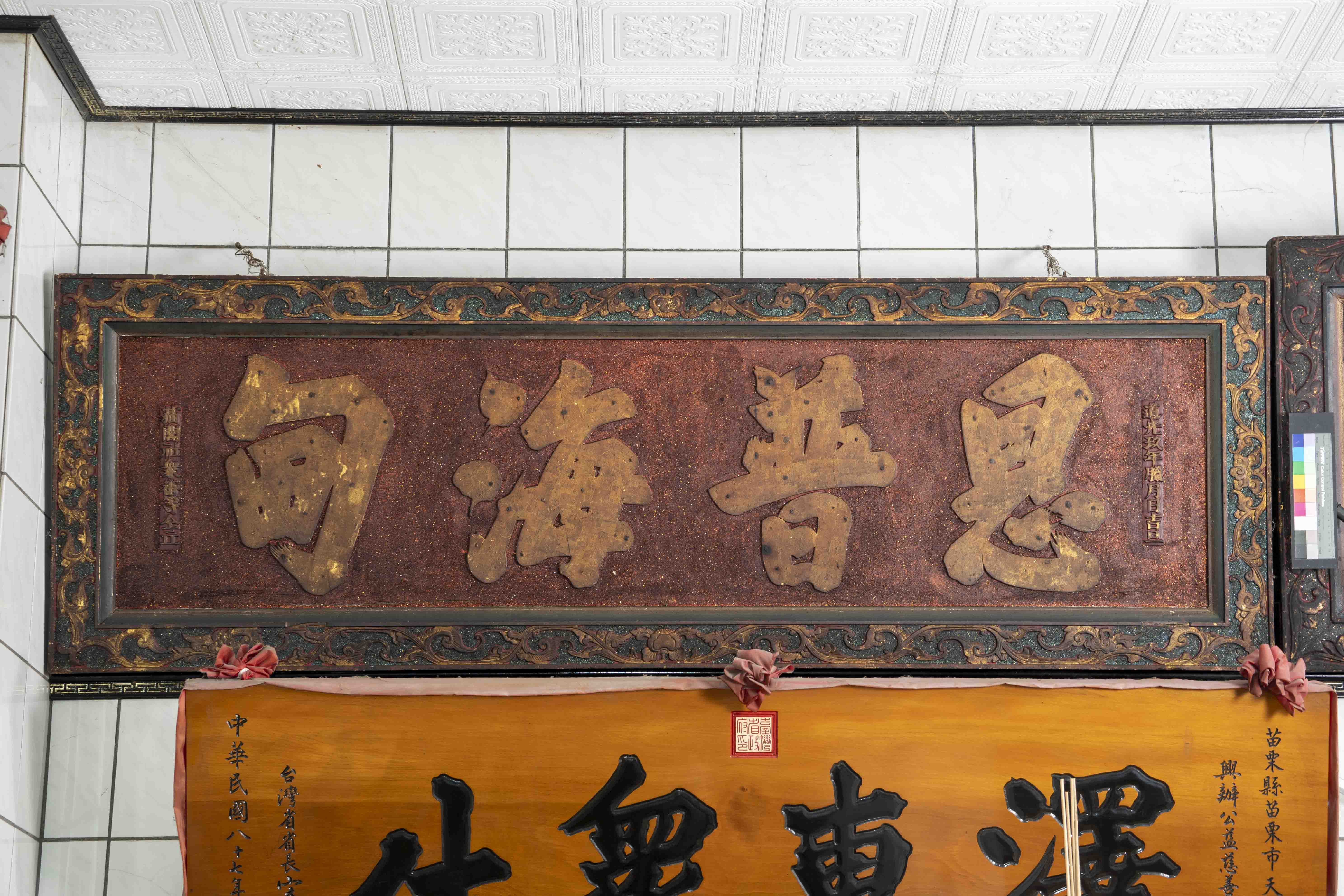 一、 本匾為清道光九年貓閣社平埔族社敬獻給苗栗天后宮之匾額,反映拓墾苗栗平原的客籍漢人與平埔族間之文化交融。 二、 匾體整體結構完整,上下款及中行文字與板面嵌合方式與19世紀初葉製匾工藝相符。