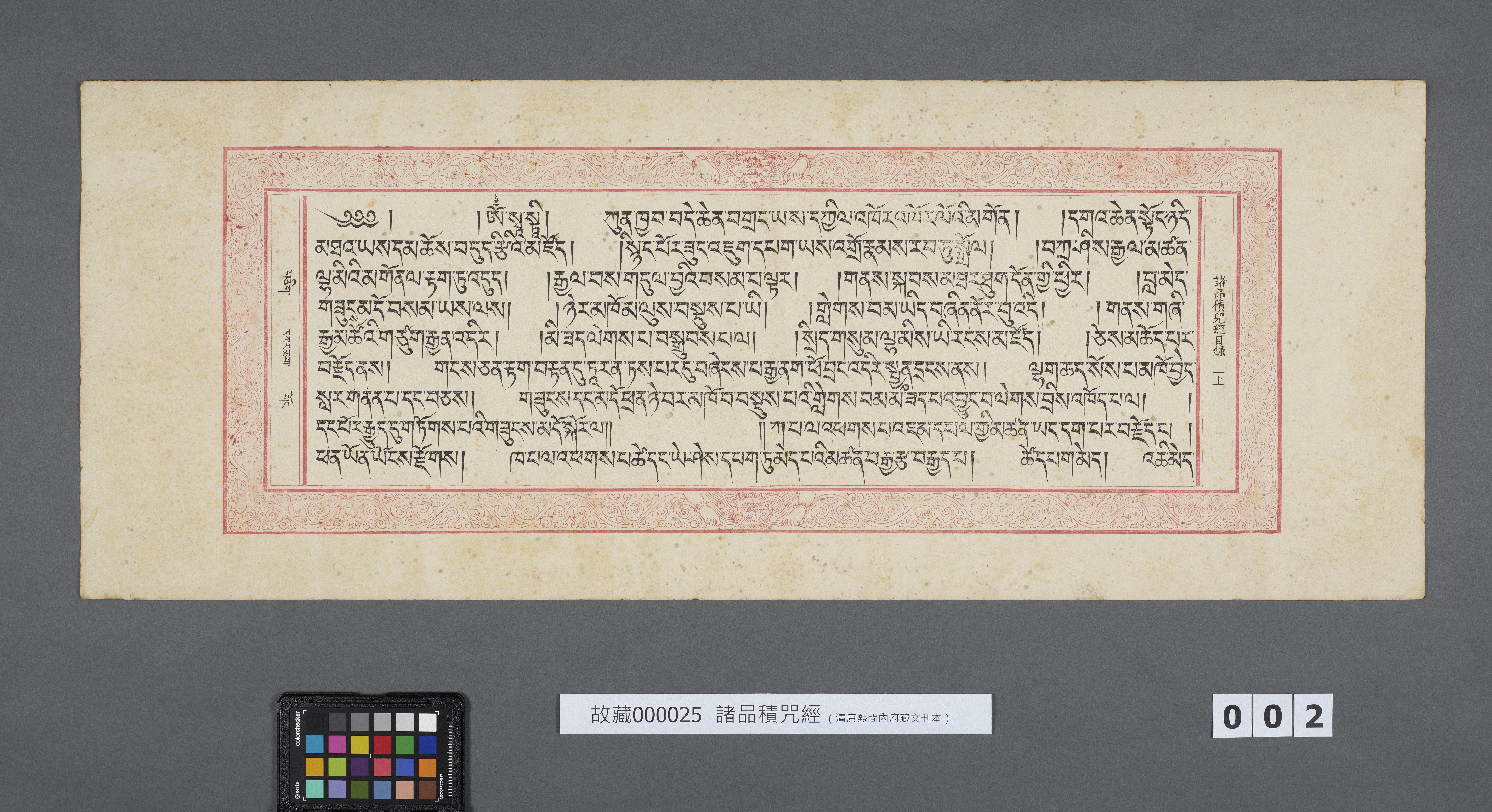 一、 乾隆皇帝於乾隆五十七年(1792)頒布《喇嘛說》中曾言:「興黃教,即所以安眾蒙古。」可代表滿人於建立大清王朝後,為何獨尊藏傳佛教格魯派(黃教)之總體考量:格魯派在十七世紀已是當時蒙藏民族共同崇奉佛教教派,透過清廷繼續扶植,於政治、宗教、文化上均可達到維繫滿、蒙、藏間之統合。自康熙朝起,清帝下令於北京製作蒙藏語文「甘珠爾」與「丹珠爾」,均於此背景下陸續進行。 二、 《諸品積咒經》為傳統梵篋形式,傳統白色藏紙濃墨精鈔,康熙13年(1674)七月寫畢,據推測此經是為祝賀康熙皇帝二十歲壽辰所造。 三、 內收密咒陀羅尼及短篇佛教經典共167部,屬藏傳佛教《陀羅尼集》類別,此類文獻在西藏歷史上曾由不同宗派祖師先後編纂。此部寫本係依據覺囊派祖師多羅那他(1575-1634)所編版本增補而成,其內容特徵是收入多羅那他撰寫〈所願悉生〉內容目錄,並將《文殊真實名經》冠為此函首部,且該經採用夏魯譯師所譯之最晚藏文譯本,迥異於大部份藏文藏經版本,富含學術研究價值。 四、 全函裝潢考究,製作精美,經葉以藏文楷體鈔寫。藏文跋文多處明述抄經功德迴向:祈請康熙皇帝帝祚遐永,子孫綿源不絕,群生滿願安樂。